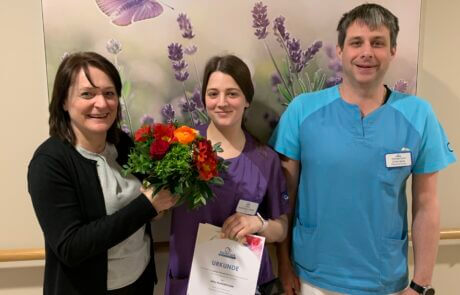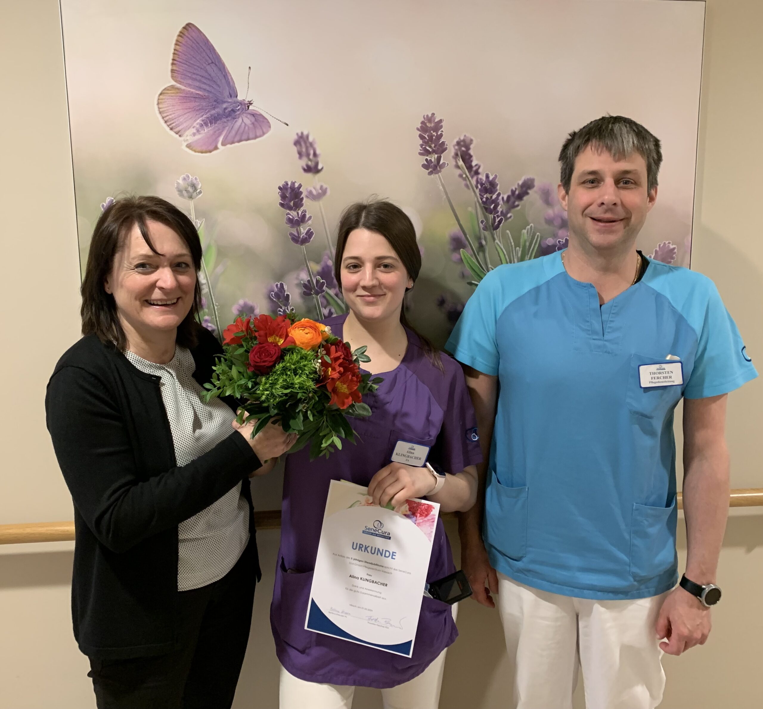 Hausleitung Bettina Kreuzer und Pflegedienstleitung Thorsten Fercher ehrten Pflegeassistentin Alina Klingbacher zum 5-jährigen Dienstjubiläum im SeneCura Pflegezentrum Vassach. Beide betonten, wie wichtig es ist, solch engagierte und motivierte Mitarbeiter im Team zu haben und sprachen nochmals ein großes DANKESCHÖN für ihr Engagement und ihre Einsatzbereitschaft aus.