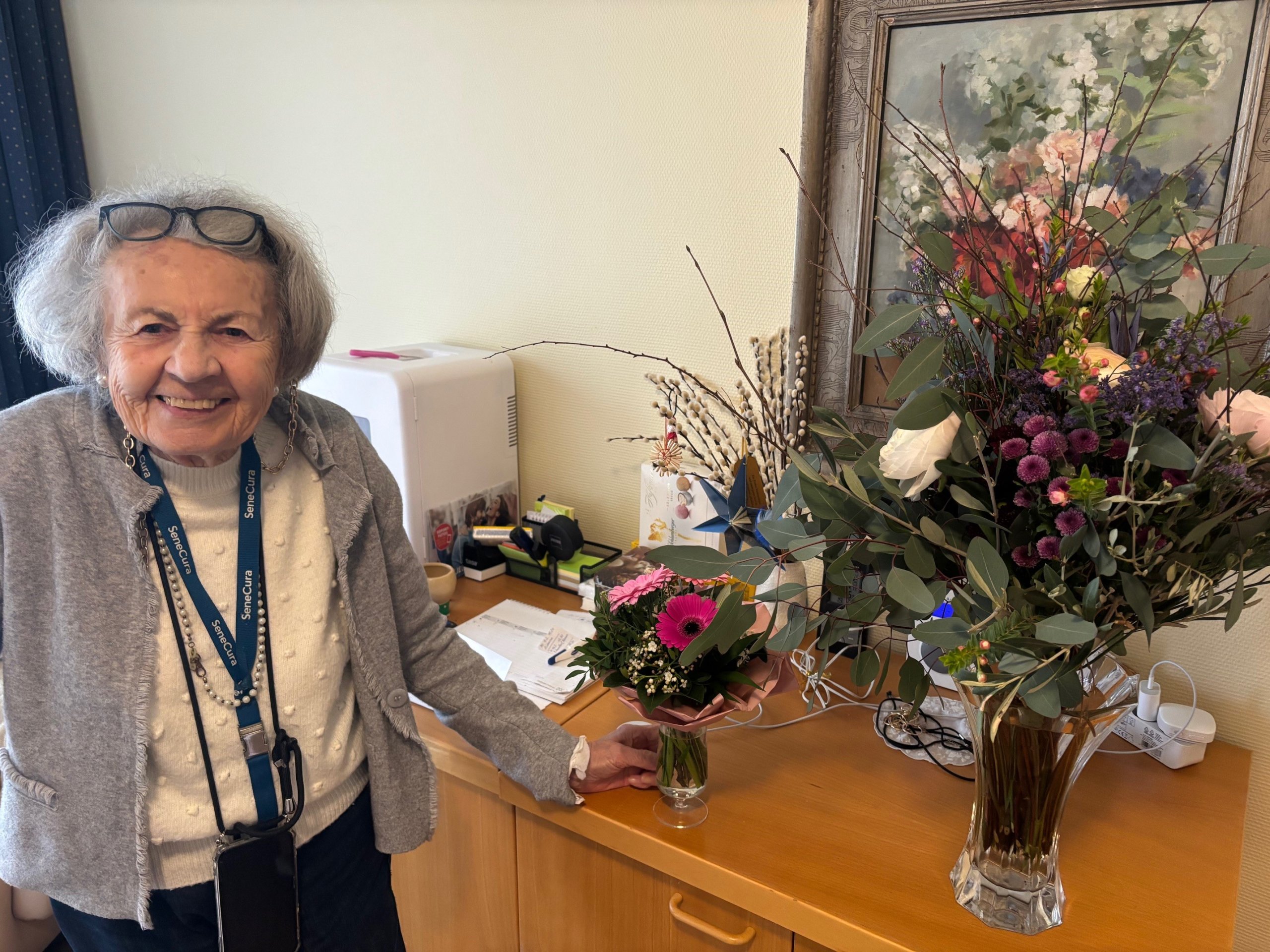 Besonders groß war die Freude über den Besuch ihres Sohnes, der persönlich zum Gratulieren kam. Von ihrem zweiten Sohn erhielt sie einen wunderschönen, riesigen Blumenstrauß, der für strahlende Augen sorgte.