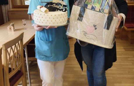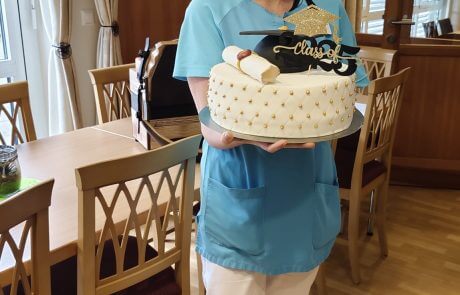 Das gesamte Team des Hauses gratuliert Lucie herzlich, freut sich sehr mit Lucie und ist unglaublich stolz auf sie. Als Überraschung wurde Lucie musikalisch durchs Haus begleitet und ihr wurde eine selbstgebackene „Bachelor-Torte“ aus der Kunstbäckerei der Fam. Schildberger und ein Geschenkskorb mit vielen verschiedenen Tees überreicht. Außerdem musste sie als kleiner Gag einen ganzen Tag lang den Bachelor-Hut tragen.