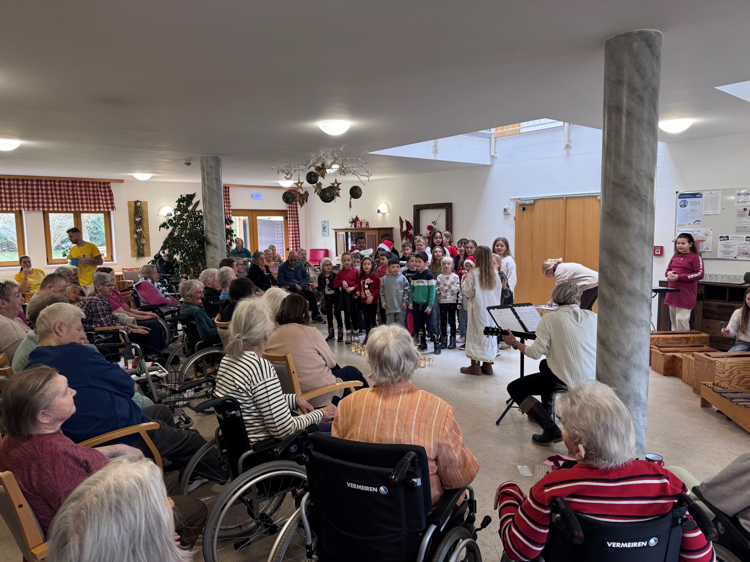 Unser großer Speisesaal war bis auf den Rand gefüllt und lockte sogar die Mitarbeiter aus dem Dienstzimmer, weil uns die Schüler nicht nur mit ihrer Stimme, sondern auch mit mitgebrachten Instrumenten derart schwungvoll begeisterten, dass die Bewohner mitgetanzt, mitgeklatscht und mitgesungen haben. Zu Tränen gerührt waren einige auch, als wir sogar selbstgebastelte Weihnachtsgeschenke für jeden Bewohner übergeben bekommen haben und als Draufgabe sogar noch selbstgebackene Kuchen von den Eltern.