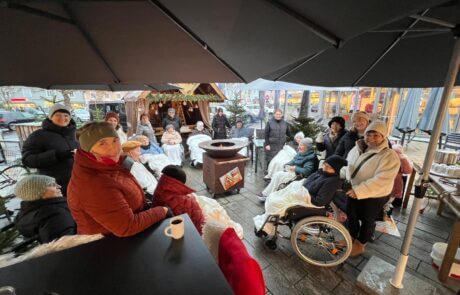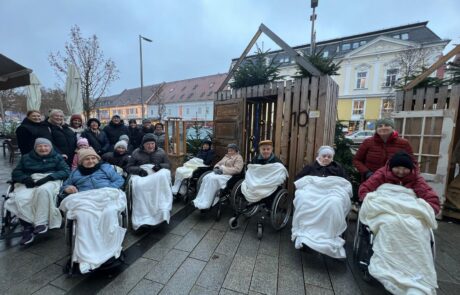 Kürzlich unternahmen die Bewohner:innen des SeneCura Sozialzentrums Feldbach in Begleitung von den ehrenamtlichen Mitarbeiter:innen sowie einigen aus dem Team einen idyllischen Adventspaziergang in die Stadt Feldbach. Auf dem Weg wurde auch die selbstgestaltete Adventhütte in Feldbach besucht, was alle sehr freute. Natürlich durfte ein Stopp beim Glühweinstand vom Café Fuchs nicht fehlen und so genossen die Ausflügler:innen den ein oder andren Glühwein, Punsch oder auch Baumkuchen. In der gesamten Stadt Feldbach stehen insgesamt 24 Holz-Adventhütten, welche von Betrieben, Schulen, Kindergärten, etc. dekoriert werden. Das SeneCura Sozialzentrum Feldbach hat die Hütte Nummer 10, welche erst am 10.12.2024 geöffnet wurde, gestalten dürfen. Anlässlich des 25-jährigen Jubiläums des Sozialzentrums wurde die Hütte wunderschön in Gold und Blau geschmückt.