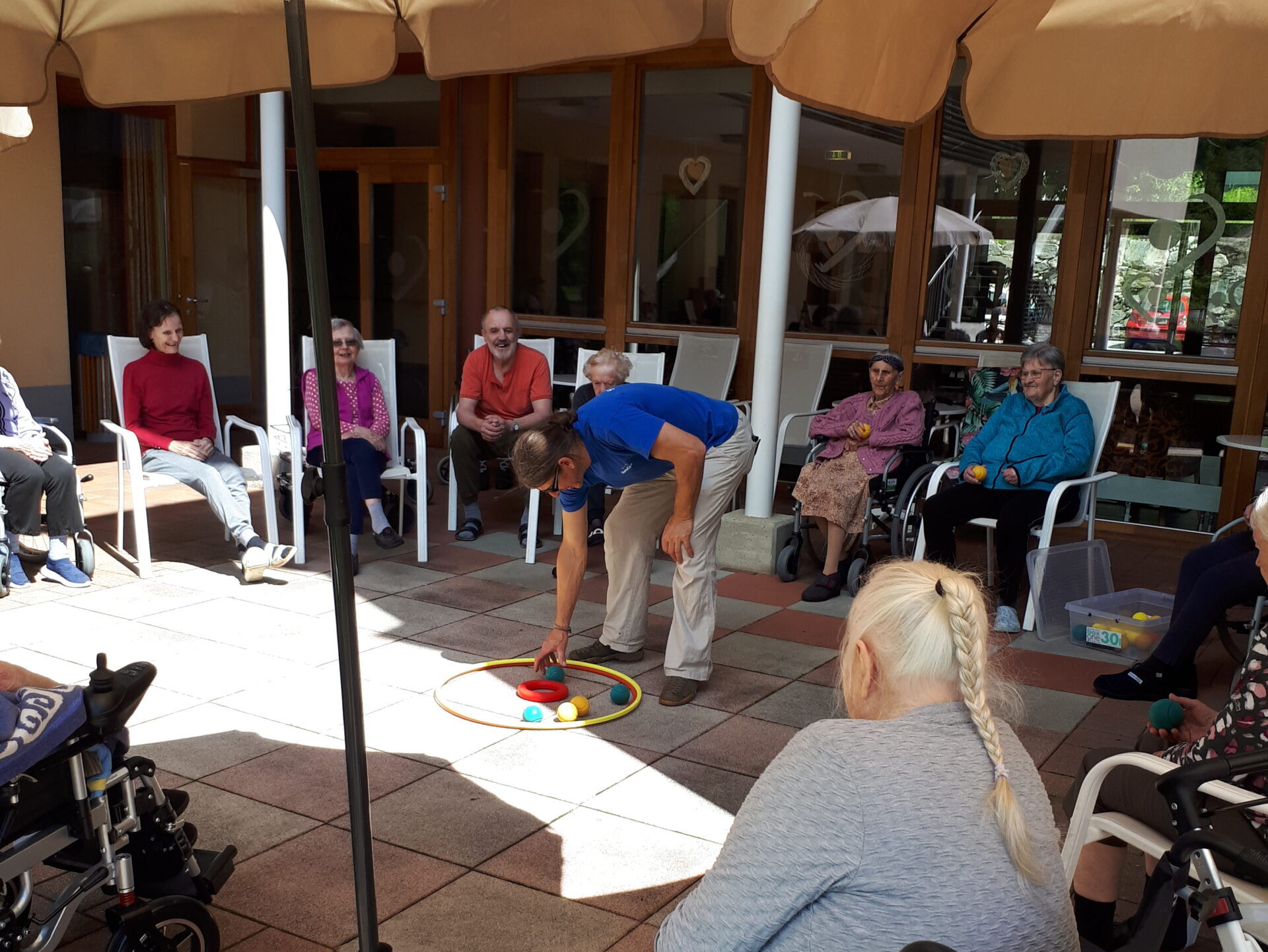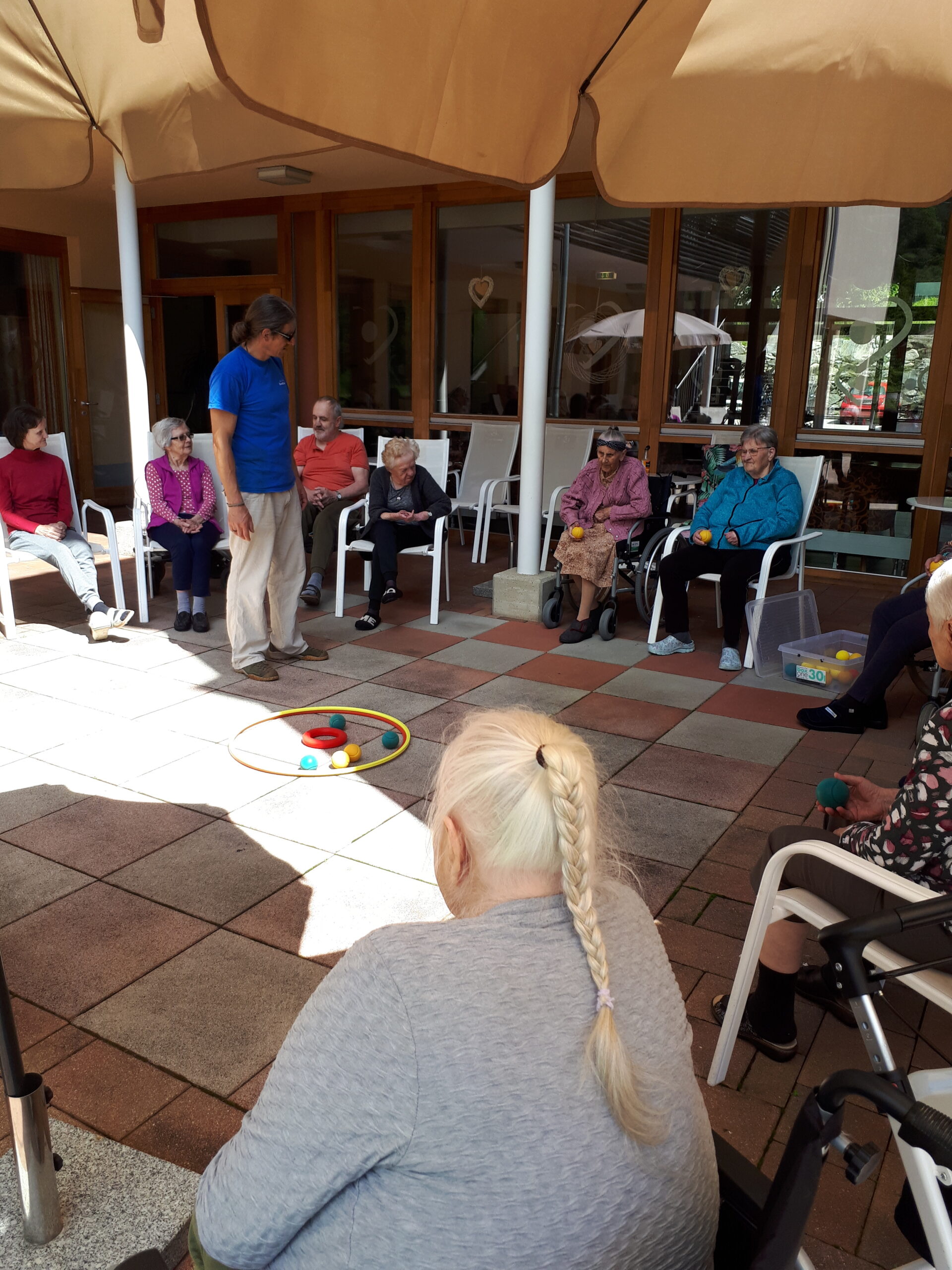 Letzte Woche ermöglichte das wunderschöne Wetter die erste Aktivierung im hauseigenen Garten des SeneCura Sozialzentrums Mühldorf. In einem Sitzkreis und bestückt mit diversen Ringen sowie Bällen aktivierten die Bewohner:innen fleißig ihre Muskeln und kognitiven Fähigkeiten. Die regelmäßigen Aktivierungen fördern nicht nur die Gesundheit der Bewohner:innen, sondern sorgen gleichzeitig für jede Menge Spaß!
