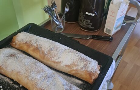 Der köstliche Duft von Zimt und Äpfeln zog kürzlich durch das SeneCura Sozialzentrum Dornbirn – es gab hausgemachten Apfelstrudel mit Äpfeln vom hauseigenen Apfelbaum. Im Zuge einer geselligen Nachmittagsrunde wurden die Bewohner:innen mit köstlichem Apfelstrudel und verschiedenen Eissorten verwöhnt. Das ganze Haus freute sich über das leckere Gebäck und verbrachte einen unterhaltsamen Nachmittag mit Eis, Strudel und netten Plaudereien.