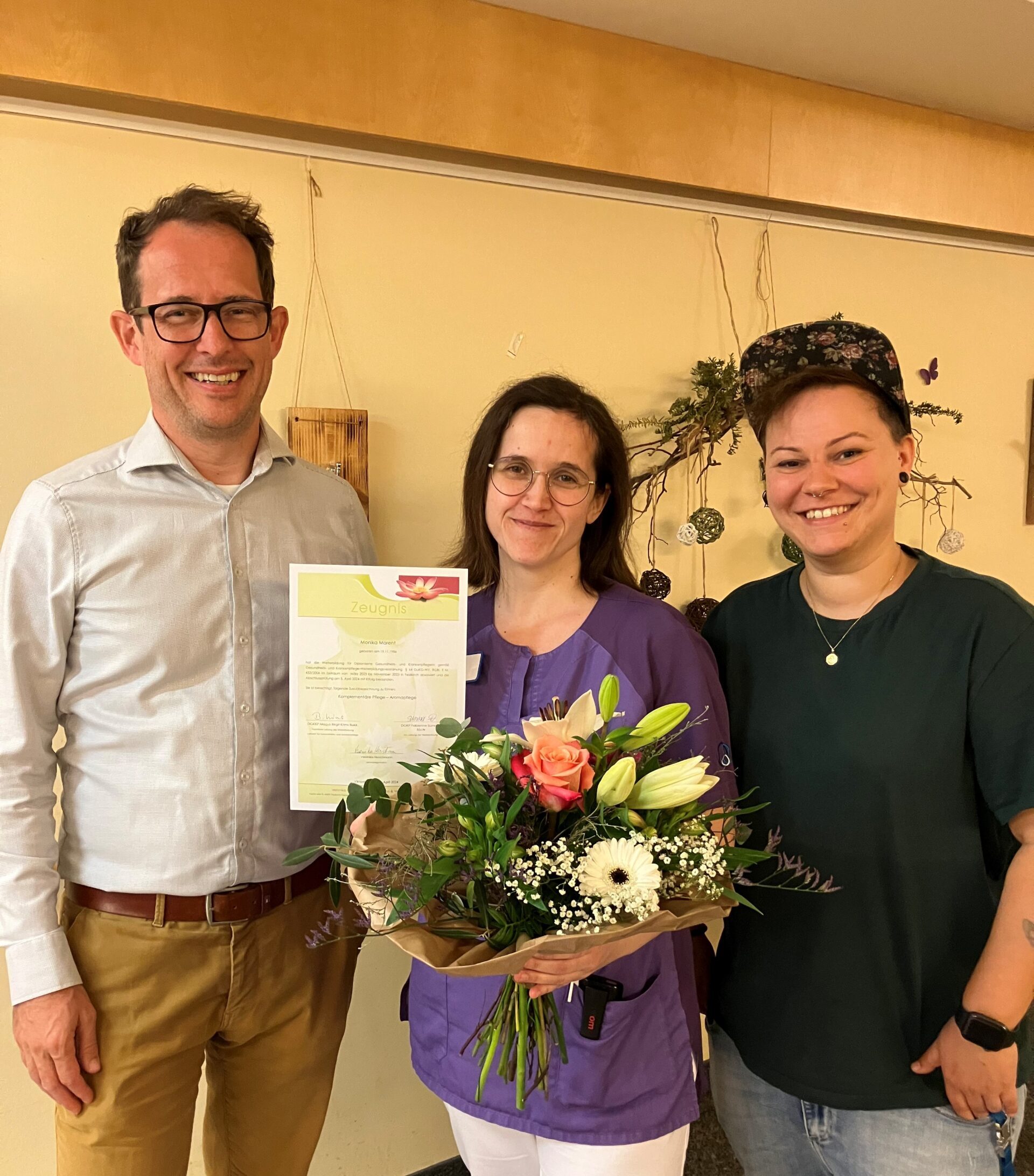 „Die Aromapflege ist in Herrenried ein essentieller Bestandteil in der täglichen Pflege und Betreuung unserer Bewohner:innen und die stetige Fort- und Weiterbildung unserer Mitarbeiter:innen ist uns sehr wichtig. Wir gratulieren Monika von Herzen zum bestandenen Abschluss.“, so PDL Melanie Stemer.