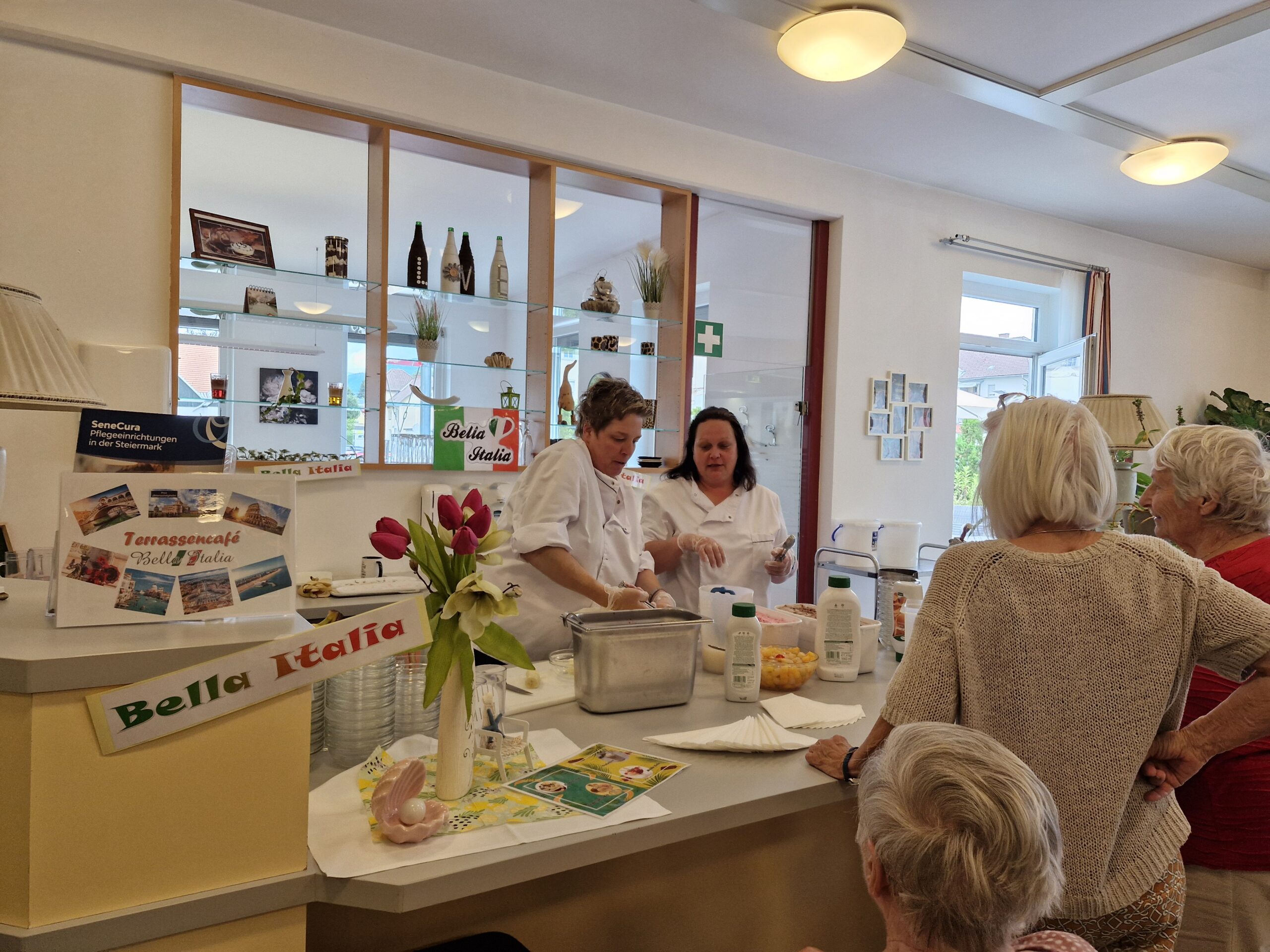 In der Cafeteria des SeneCura Sozialzentrums Knittelfeld hieß es vor kurzem „Bella Italia“ und demnach fand ein köstlicher Eisnachmittag für die Bewohner:innen statt. Viele Seniorinnen und Senioren folgten der Einladung und freuten sich über das kühle Angebot. Zur Auswahl stand gemischtes Eis wahlweise mit oder ohne Früchten, Heiße Liebe oder Bananensplit.