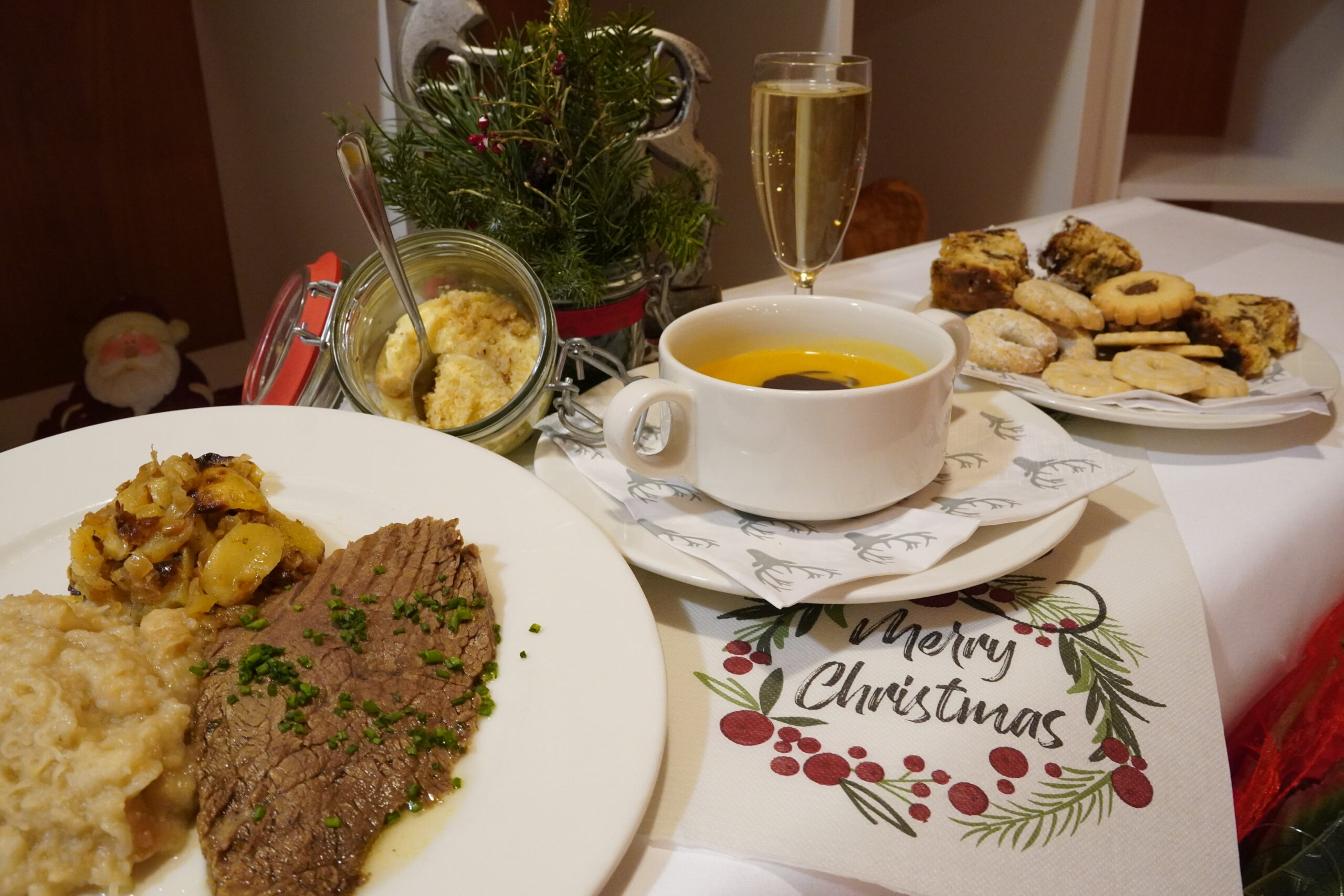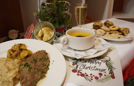Das leibliche Wohl darf auch nicht fehlen. Das Menü war sehr traditionell aber ausgezeichnet, es gab Kürbiscremesuppe, Tafelspitz, Röstkartoffeln und Semmelkren. Zum krönenden Abschluss gab es eine Vanillekipferl-Creme. Bier, Sekt und Eierlikör gab es um den Durst zu löschen.