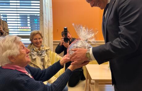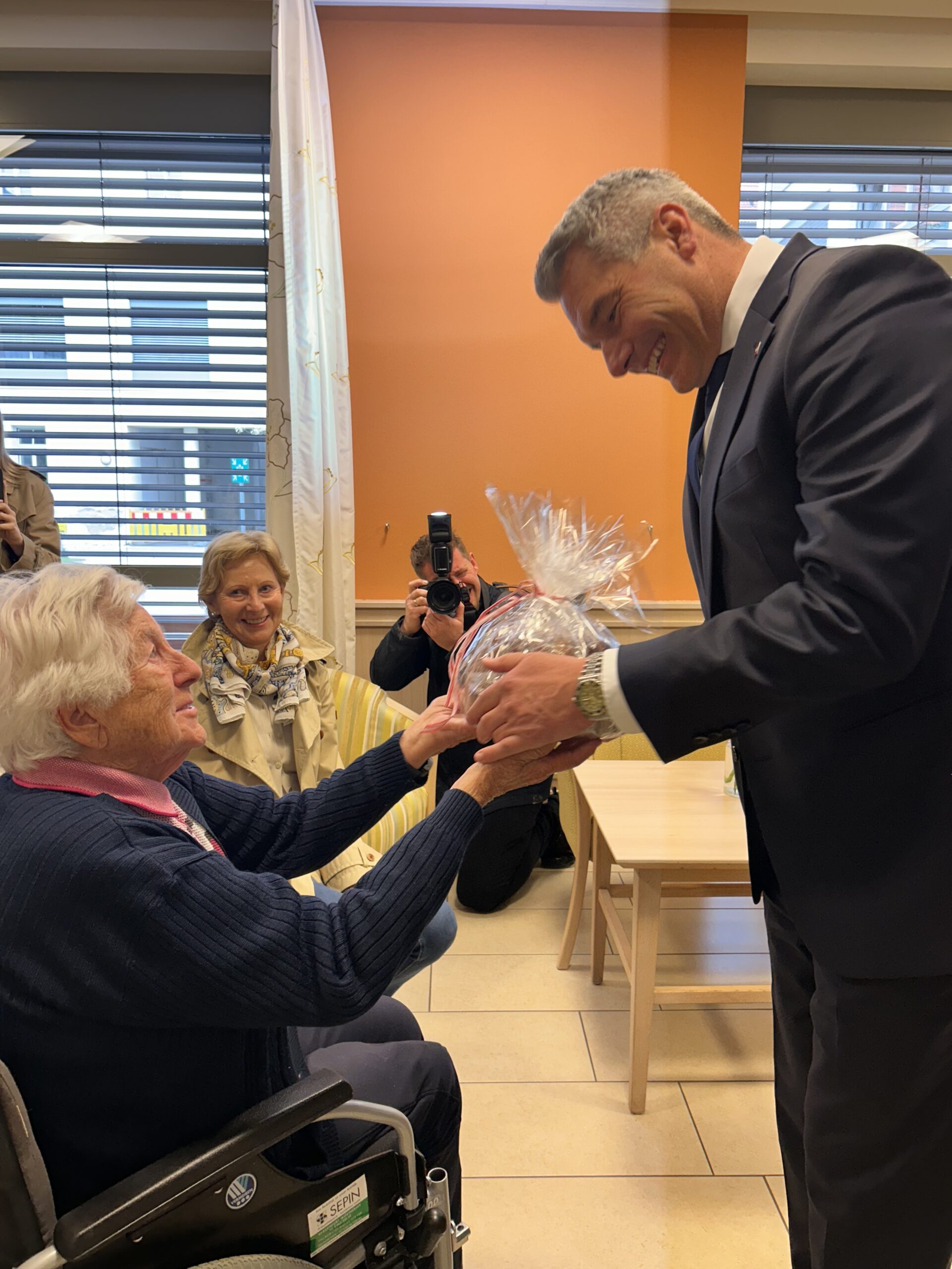 Bundeskanzler Nehammer mit Jubilarin Frau Schaffer.