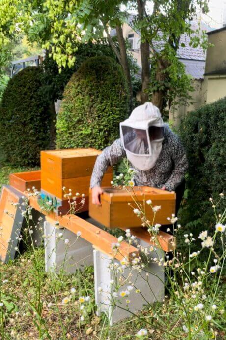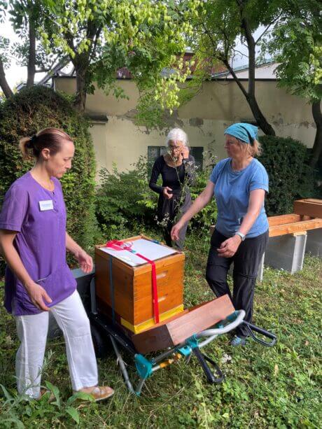 Viele Menschen haben zu Bienen eine emotionale Beziehung, da fast jeder mit ihnen eine Erinnerung verbindet. Sei es, bei Menschen, die am Land aufgewachsen sind, dass in der Familie oder Umgebung Bienen gehalten wurden oder sei es über ein Honigbrot, das in manchen Situationen auch als Trost oder als liebevolle Geste der eigenen (Groß-)Eltern kredenzt wurde. Bienen sind den wenigsten Menschen gleichgültig. Um diesen Kontakt wieder aufzunehmen und ein Stück Naturverbundenheit zu ermöglichen, wurde nun an einem ruhigen Platzerl im Innenhof der SeneCura Residenz Grinzing ein Bienenstock aufgestellt. Dieser soll als Pilotprojekt die Bewohner:innen mit eigenem Frühstückshonig versorgen und dazu anregen, über ihre Erlebnisse und Erinnerungen im Zusammenhang mit Bienen zu erzählen und vielleicht wieder in eine Phase ihrer Kindheit einzutauchen. Die Bienen werden von zwei Imkerinnen betreut und ab 2025 kann Honig und frischer Wabenhonig geerntet werden.