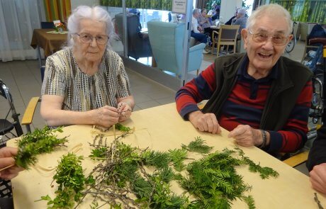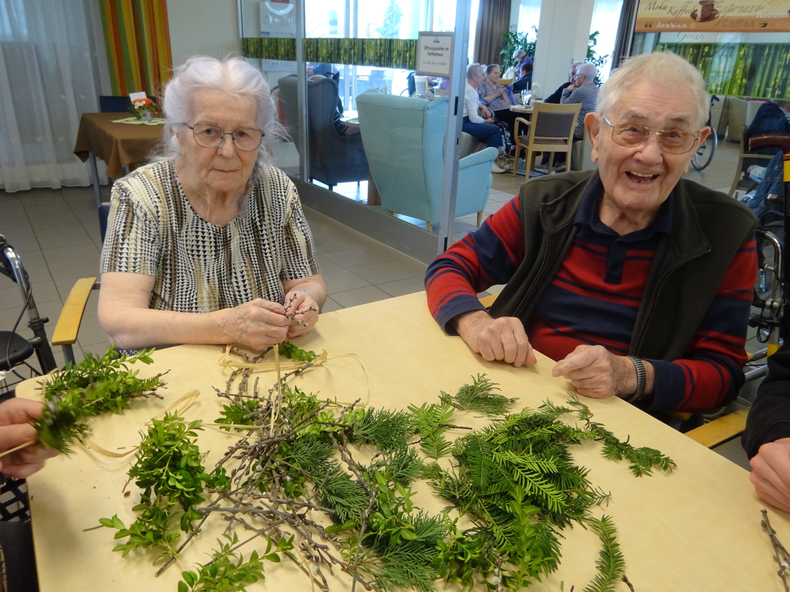 Gemeinsam mit den Firmlingen der Gemeinde Strass wurden rund 220 Palmbuschen gebastelt. Die Palmkätzchen wurden im Vorfeld gesammelt, und nach der Weihe am Palmsonntag erhielten die Bewohner:innen ihre Palmbuschen direkt ins Zimmer – eine Tradition, die ihnen besonders am Herzen liegt.