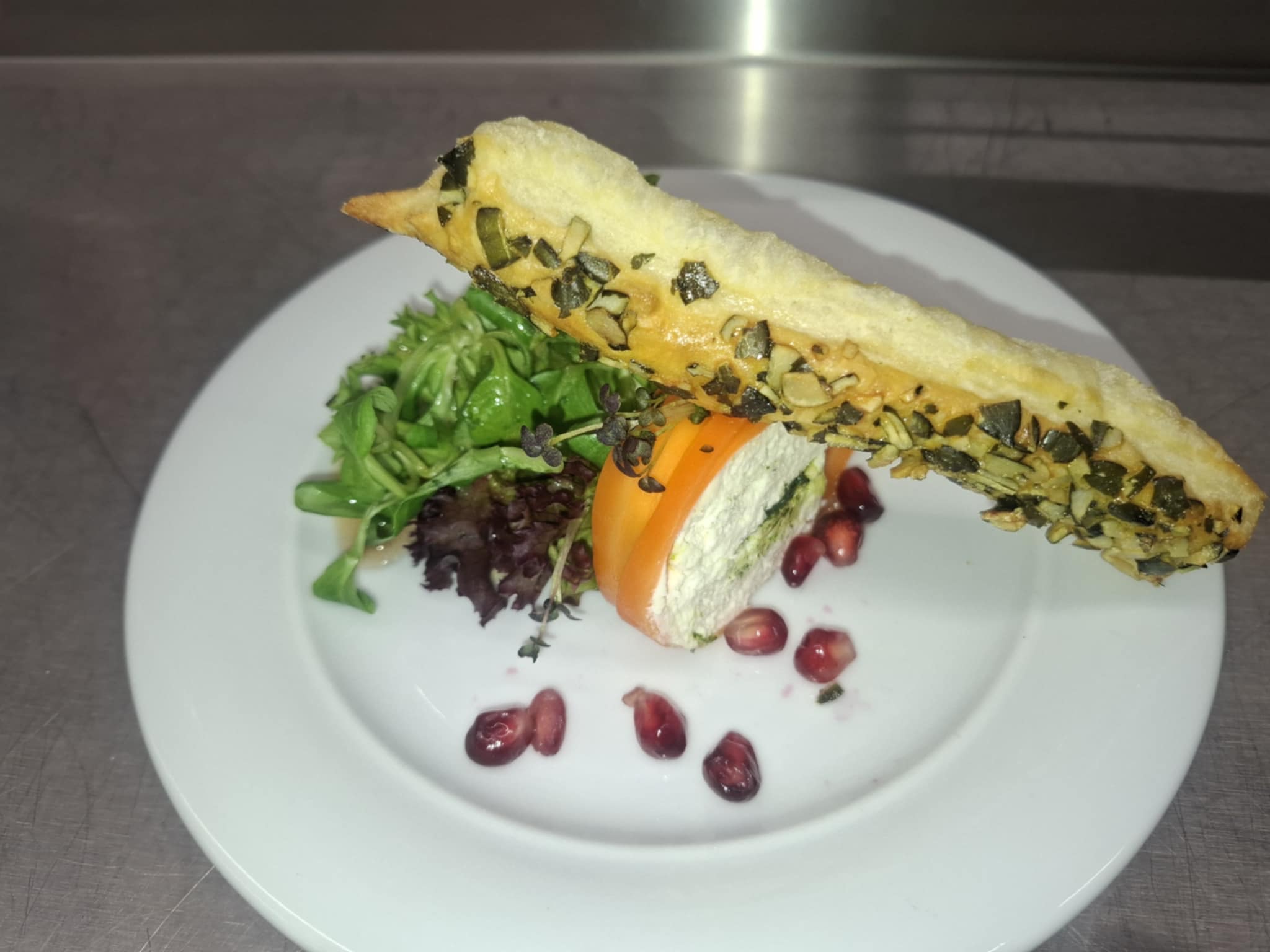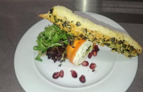 Die Vorspeise mit Lachsröllchen und herrlich frisch gebackenen Kürbiskernstangerl