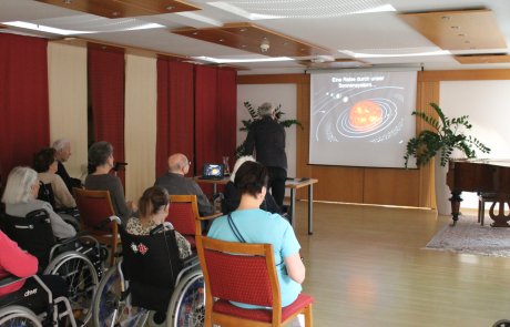 In der SeneCura Residenz Grinzing erwartete die Bewohner:innen ein ganz besonderes Highlight: Die ehrenamtlichen Mitarbeiter:innen gestalteten einen spannenden Diashow-Vortrag über das Sonnensystem. Mit beeindruckenden Bildern, leicht verständlichen Erklärungen und vielen interessanten Fakten nahm das Team die Zuhörer:innen mit auf eine Reise durch unsere Galaxie.