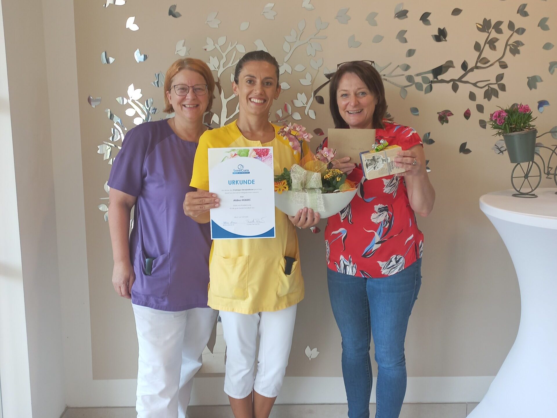 Pflegeassistentin Aldina Hodzic unterstützt das Team des SeneCura Pflegezentrums Vassach seit insgesamt 15 Jahren. Besonders beliebt ist Aldina wegen ihrer freundlichen und ruhigen Art. Hausleitung Bettina Kreuzer und Wohnbereichsleitung Bettina Kirchbaumer gratulierten herzlich und bedankten sich für die Treue und gute Zusammenarbeit.