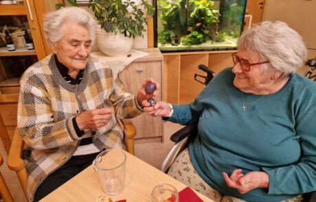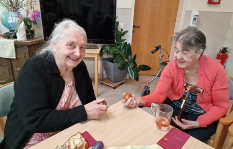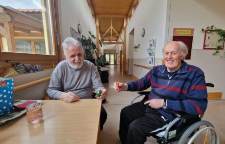 Viel Spaß hatten die Seniorinnen und Senioren des SeneCura Pflegezentrums Arnoldstein beim Eierturtschen. Das Eierturtschen ist ebenso ein alter Brauch, bei dem zwei Bewohner:innen jeweils ein Osterei aussuchen und anschließend gegeneinander antreten und die Eier aneinander schlagen. Die Person, bei dem das Ei kaputt geht, hat verloren – und wenn man gewinnt, hat man schon ein Ei mehr! Die lustige Aktivität sorgt für einiges an Spaß und alte Erinnerungen werden geweckt.