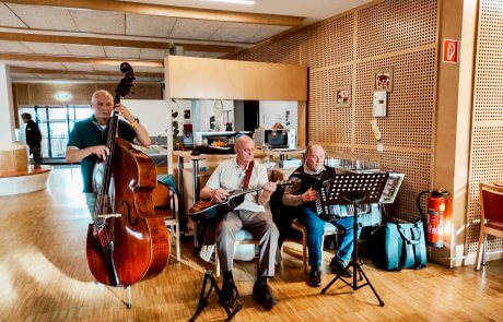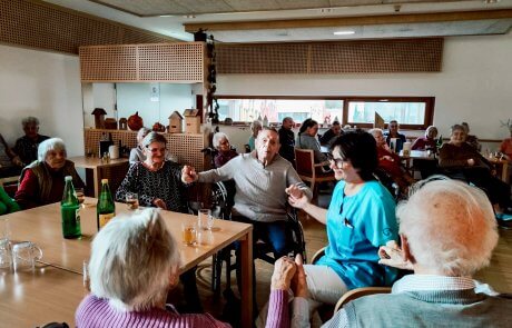 Im Anschluss fand ein weiterer Programmpunkt statt, der viel Freude bereitete: Ein mitreißender Musiknachmittag mit dem Trio „Zemagwürfelt“. Mit schwungvollen Melodien und bekannten Stücken sorgten die Musiker für beste Stimmung und zauberten vielen Bewohner:innen ein Lächeln ins Gesicht.