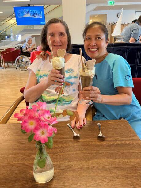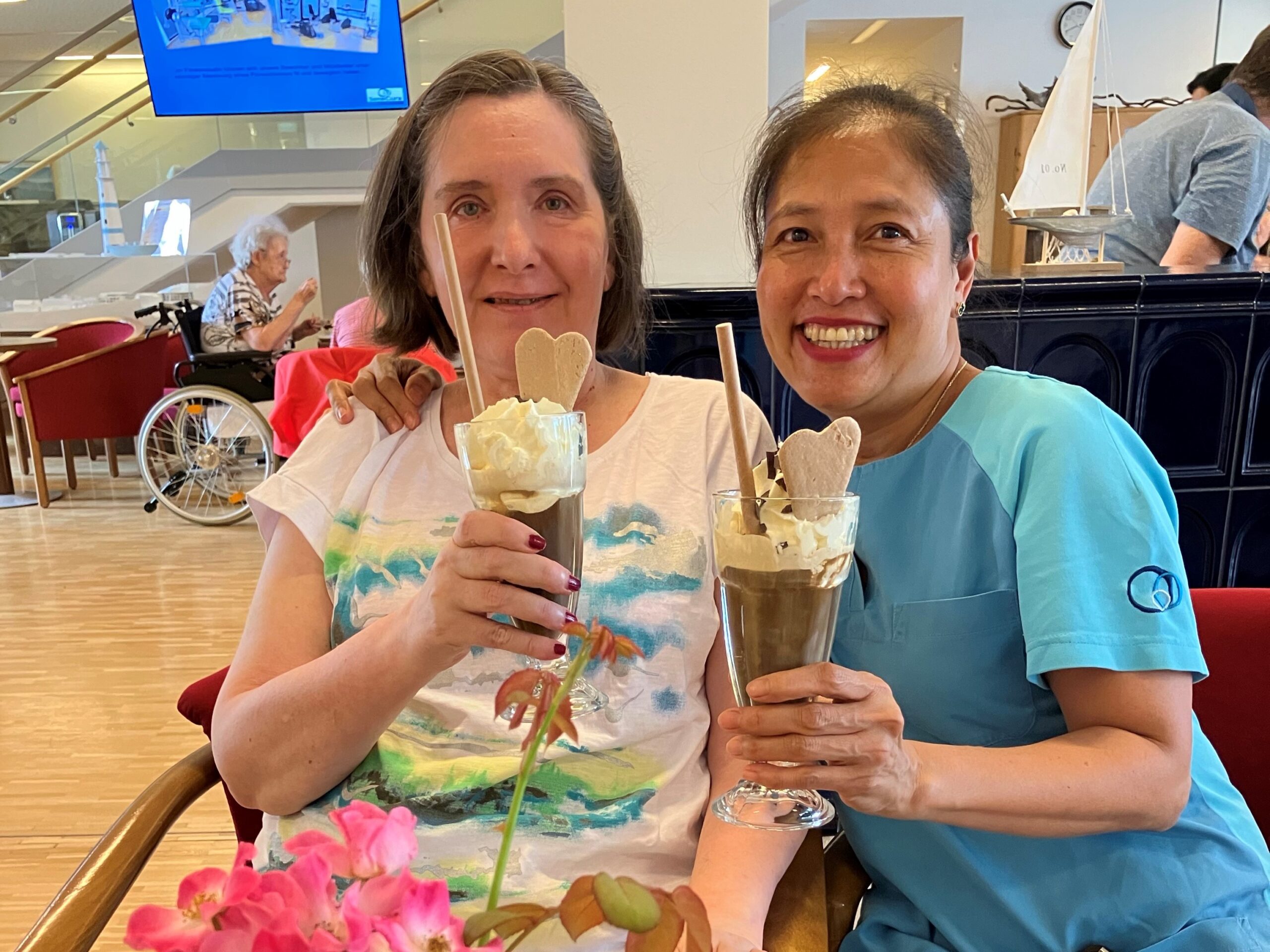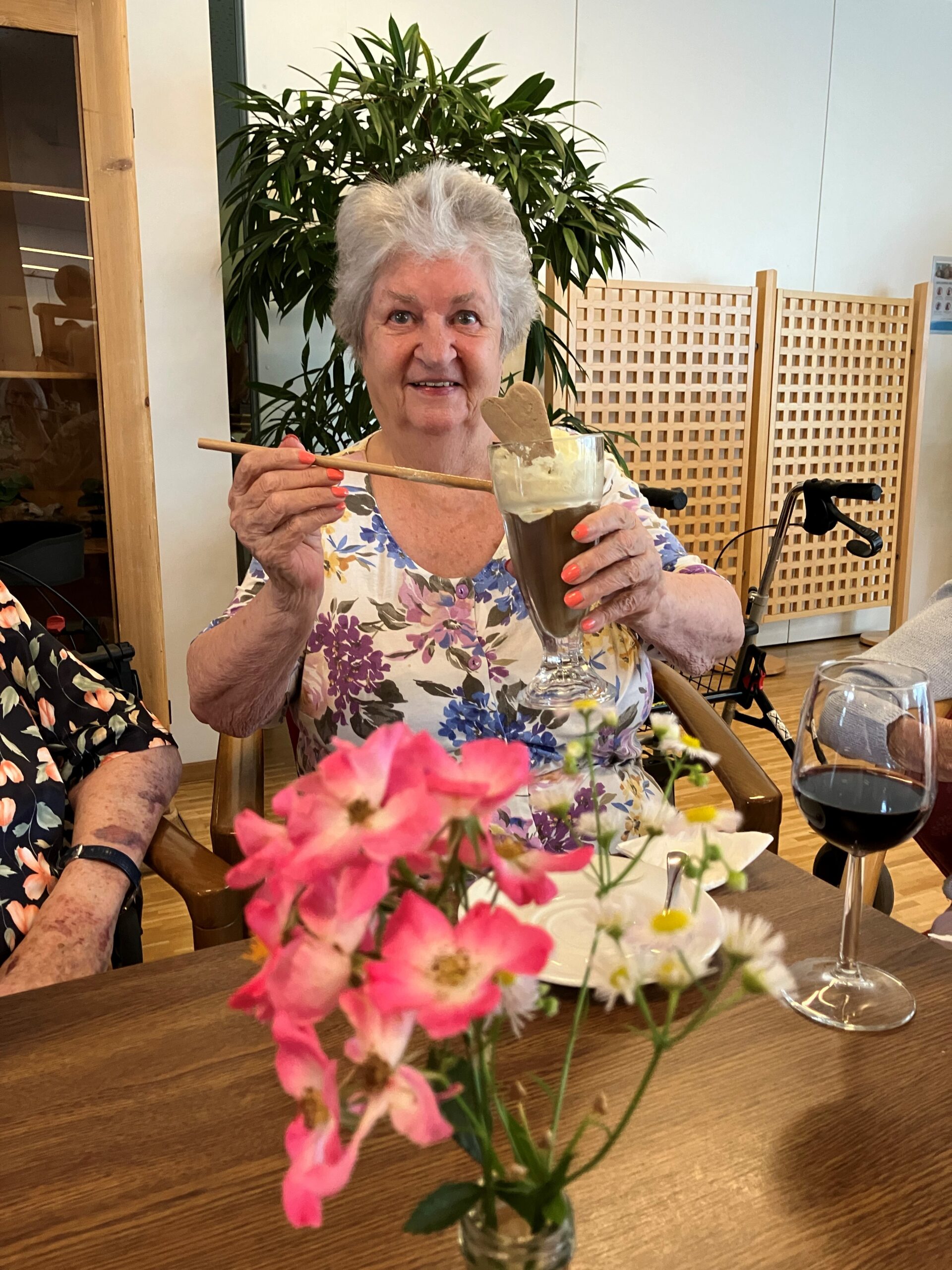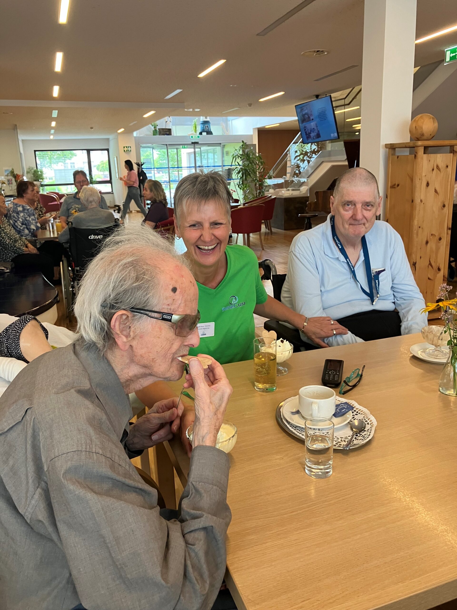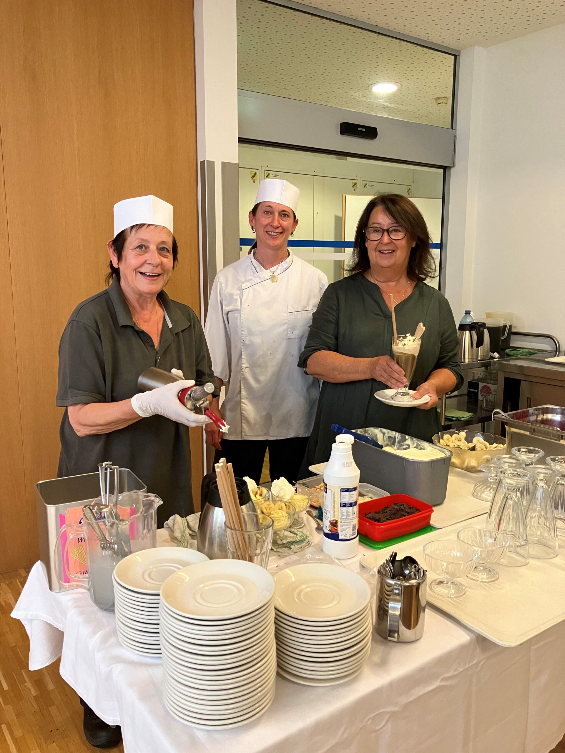 Kürzlich verwandelte sich der SeneCura Laurentius-Park Bludenz in ein Wiener Kaffeehaus. Das Ehrenamtsteam und die Mitarbeiter:innen des Hauses zauberten mit feinen Eisbechern und hausgemachten Kuchen eine entspannte Kaffeehaus-Atmosphäre. „Wir trotzen den sommerlichen Wetterkapriolen und schlemmen uns glücklich.“, so Bewohnerin Frau Schorn. Diesem Rat der rüstigen, 101-jährigen Dame sind zahlreiche Gäste gefolgt! Die Freude der Bewohner:innen über den süßen Nachmittag war groß. „An guata!“, wünscht Bewohnerin Frau Wallnöfer.