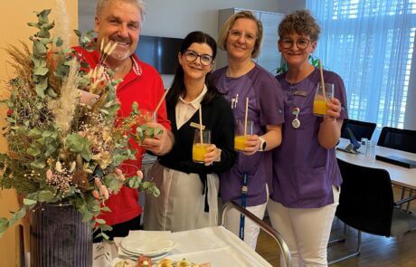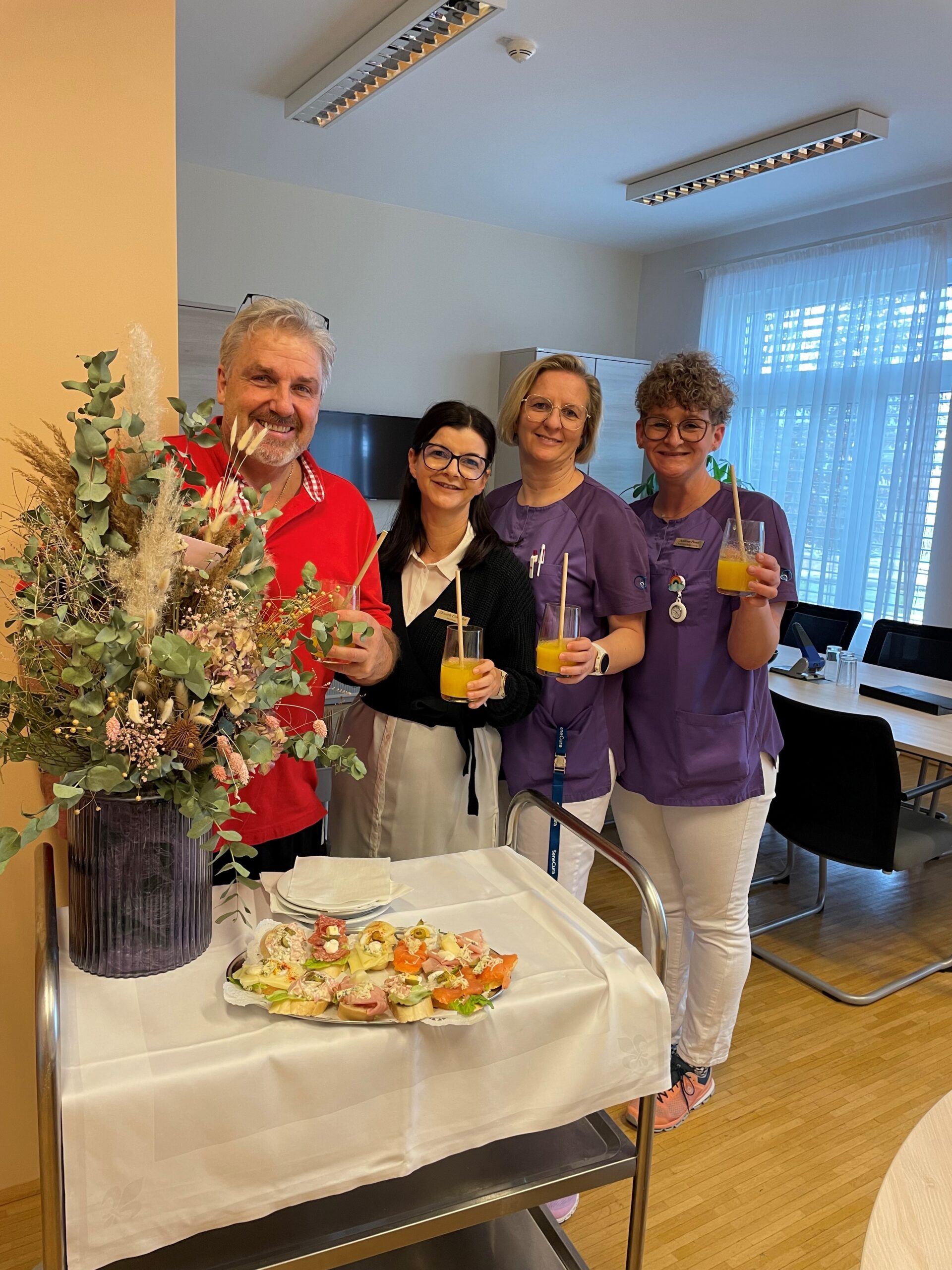 Das SeneCura Sozialzentrum Wolfsberg ist stolz, bekannt geben zu dürfen, dass die geschätzte Pflegedienstleitung Monika Kainz am 19. März 2024 die Weiterbildung in Basalem und mittlerem Pflegemanagement gemäß §64 GuKG an der EMG Akademie mit ausgezeichnetem Erfolg abgeschlossen hat. Dieser Meilenstein zeugt von ihrem unermüdlichen Engagement und ihrer Leidenschaft für die Pflege. Ein herzliches Dankeschön und Glückwunsch ergeht an Monika Kainz durch die Hausleitung, Cornelia Ozwirk und die Wohnbereichsleitung, Poms Andrea, die ihre Glückwünsche und Anerkennung ausgesprochen haben. Zu Ehren dieses besonderen Anlasses hat der Küchenleiter, Klaus Moitzi, mit bunten Brötchenvariationen und frisch gepresstem Saft für eine köstliche Überraschung gesorgt, die den Tag noch schöner machte.
