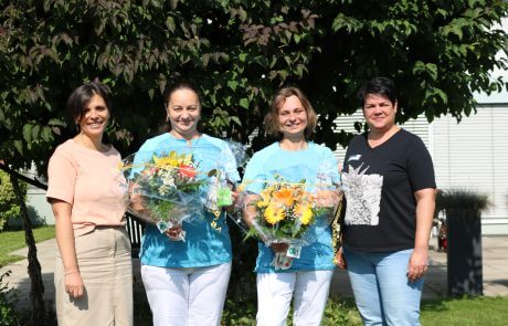 Doppelt gratuliert wurde kürzlich im SeneCura Sozialzentrum Trofaiach. Die beiden Mitarbeiterinnen Moaca Cala und Marta Kozlowska schlossen voriges Jahr die Ausbildung zur Pflegeassistentin ab und nun ein Jahr später die Ausbildung zur Fachsozialbetreuerin. Pflegedienstleitungsstellvertretung Sarah Legenstein und Hausleitung Kerstin Pöltl überreichten einen Blumenstrauß sowie einen SeneCura Trofaiach Thermobecher.