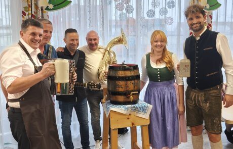 Vergangenen Freitag fand im SeneCura Sozialzentrum Söchau erstmals ein Bierfest statt – und es wurde zu einem unvergesslichen Erlebnis für alle Beteiligten. Der traditionell dekorierte Speisesaal füllte sich mit Bewohnerinnen und Bewohnern, Angehörigen sowie Mitarbeitenden, die gemeinsam einen fröhlichen Nachmittag verbrachten. Ein besonderes Highlight war der traditionelle Fassanstich: Bürgermeister Franz Jost ließ es sich nicht nehmen, das erste Fass persönlich anzuschlagen. Mit kräftigen Schlägen und dem bekannt Ruf „O´zapft is!“ wurde das Fest offiziell eröffnet – begleitet von großem Applaus und strahlenden Gesichtern. Für die passende Stimmung sorgte Live Musik, die von zünftigen Volksliedern bis hin zu bekannten Stimmungshits reichte. Schon nach kurzer Zeit wurde mitgesungen, geklatscht und sogar das eine oder andere Tänzchen gewagt. Neben frisch gezapftem Bier und alkoholfreien Alternativen gab es als herzhafte Spezialität Weißwurst und Brezeln. Die Mischung aus gutem Essen, geselligem Beisammensein und heiterer Musik machte das Fest zu einem echten Höhepunkt im Jahrskreis. Wir bedanken uns bei allen Gästen, Helferinnen und Helfern sowie beim Bürgermeister für seinen Besuch und den gelungenen Fassanstich. Gemeinsam haben wir gezeigt: Lebensfreude kennt kein Alter.