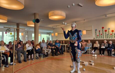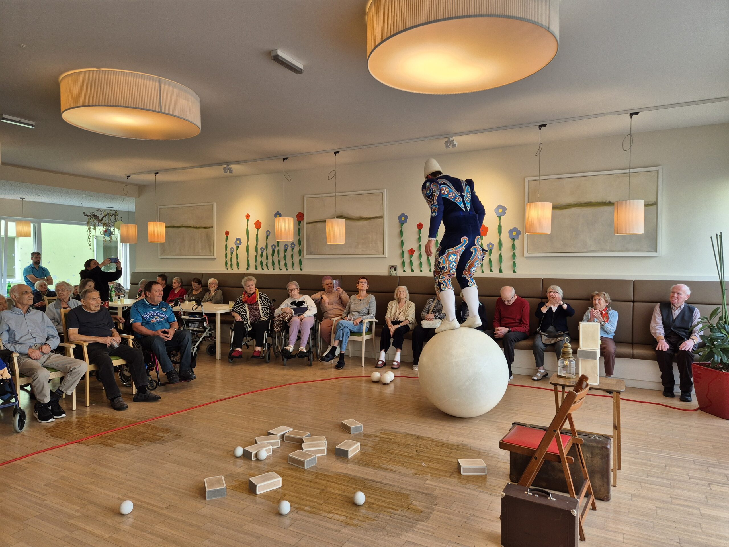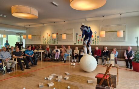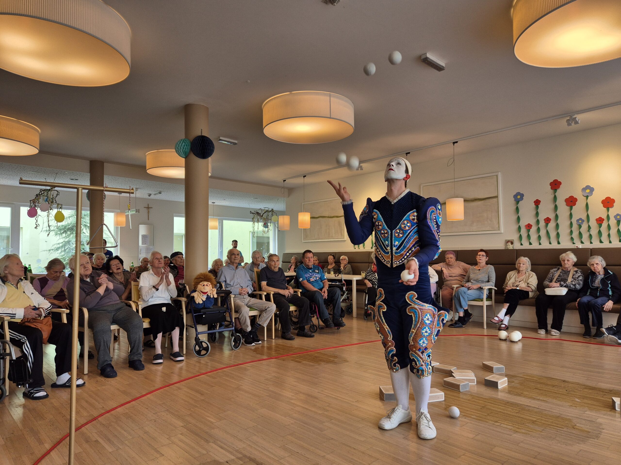 Auch im SeneCura Pflegeheim Graz-Lend hat der Weißclown, Pierre Roman, die Bewohner:innen des Hauses besucht und mit seinem Können begeistert. Der Clown ist eine Zirkusfigur aus der Vergangenheit und fasziniert mit seiner kunstvollen Akrobatik und dem raffinierten Jonglieren. Der Weißclown Pierre Roman verzaubert sein Publikum volle 40 Minuten und überrascht mit unterschiedlichen Programmpunkten immer wieder aufs Neue. Die Bewohner:innen sind rundum begeistert von dieser tollen Darbietung und freuen sich bereits auf das nächste Mal.