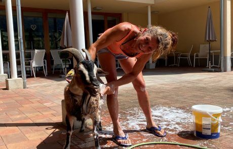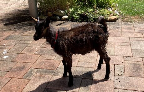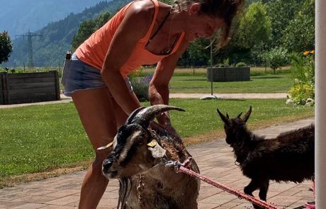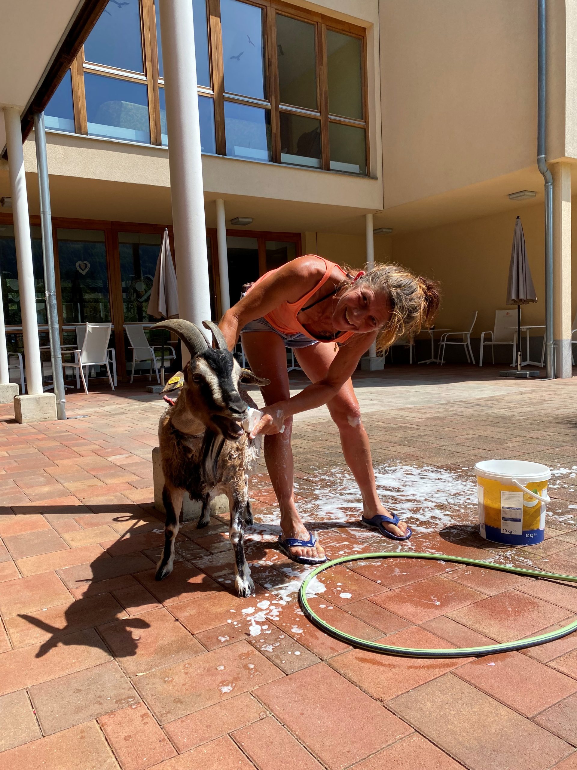 Kürzlich ging es im SeneCura Mühldorf tierisch zu. Seniorenbetreuerin Christina ist überall mit Herz dabei – auch bei ihren Ziegen, die bei uns über den Sommer im Garten weiden – wurde eine Fellpflege durchgeführt, natürlich mit passendem Shampoo. Moritz der stämmige Ziegenbock hat es mit Humor genommen (konnte man aus dem Blöcken vernehmen :) ) Ziege Heidi war etwas zaghaft und schaute sich die Waschroutine neugierig an, bevor sie an der Reihe war.