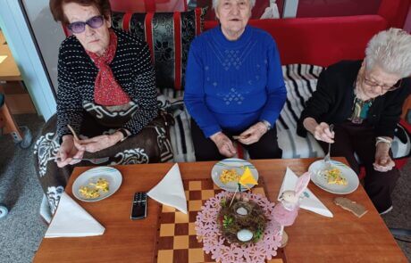 Die Bewohnerinnen lassen sich die Eierspeise schmecken.