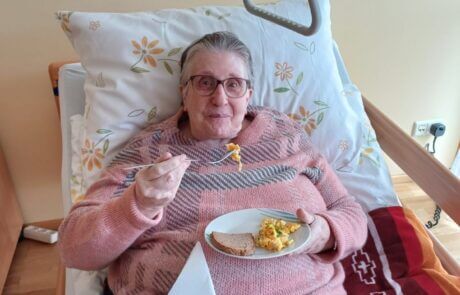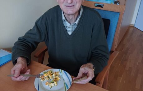 Mit viel Freude auf das Essen genießt der Bewohner die Eierspeise.