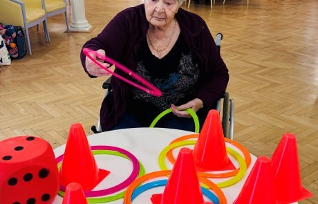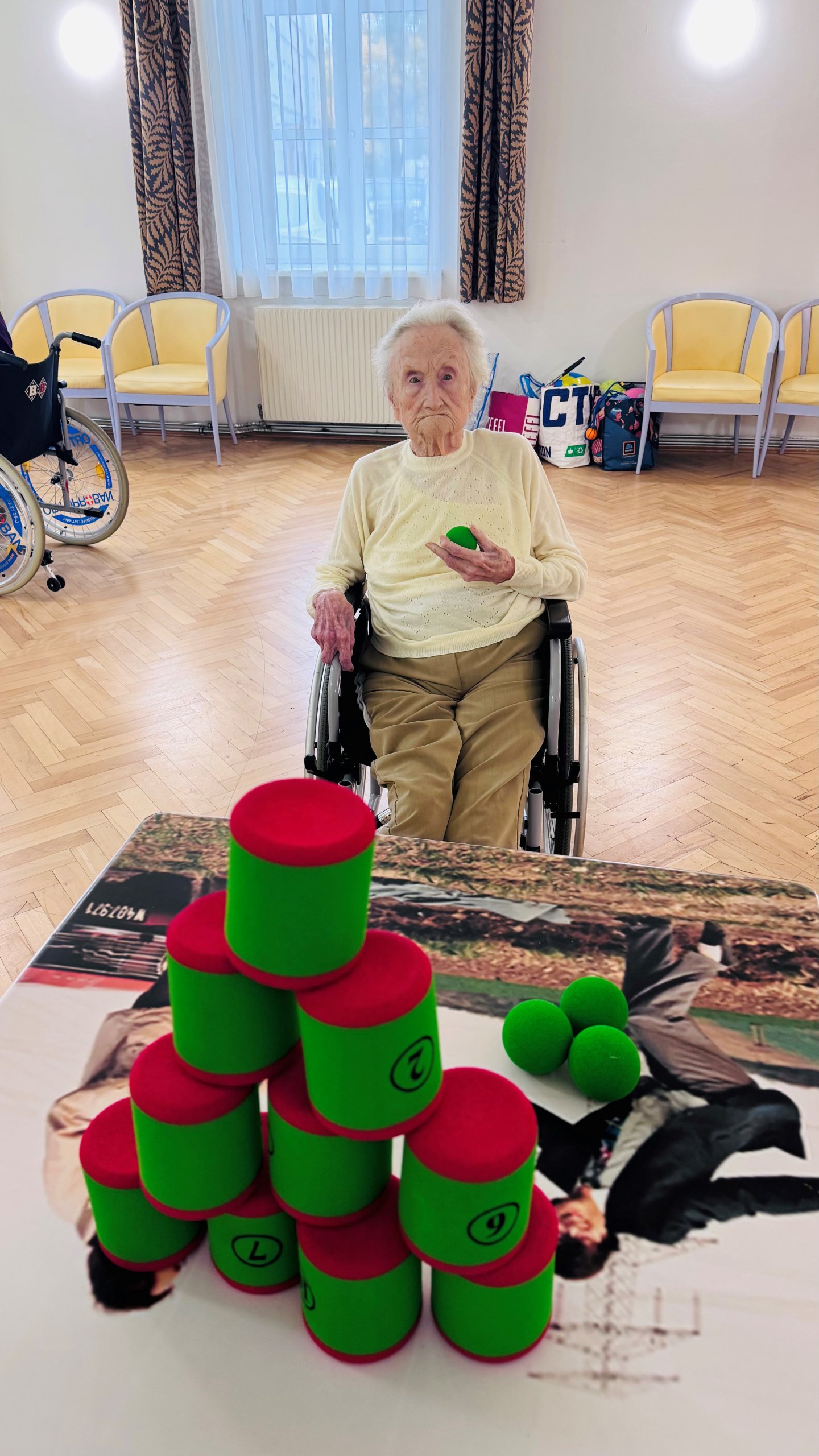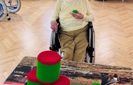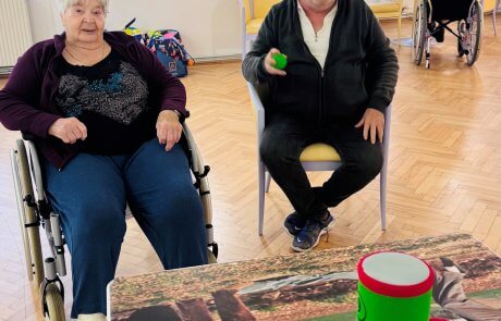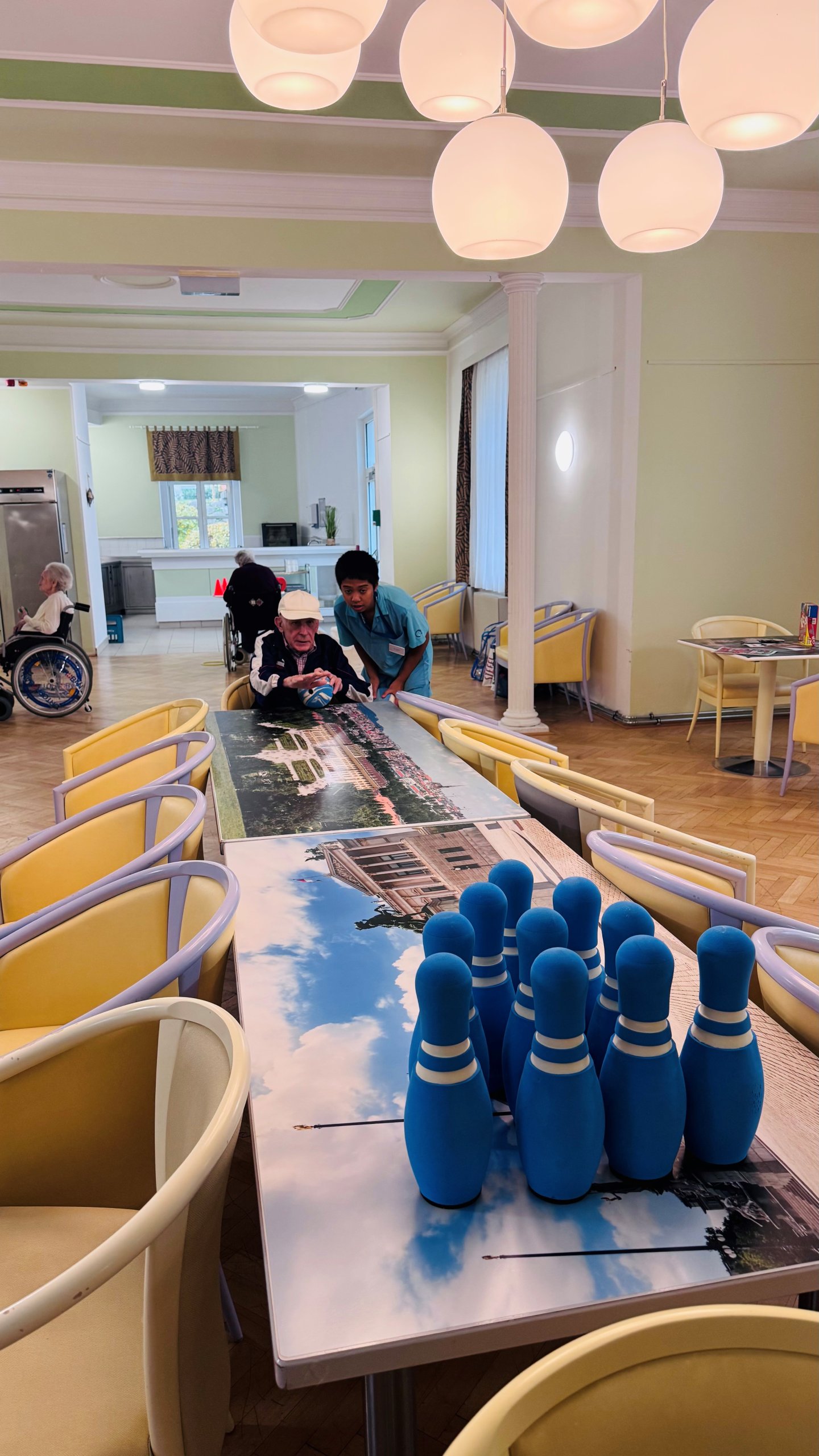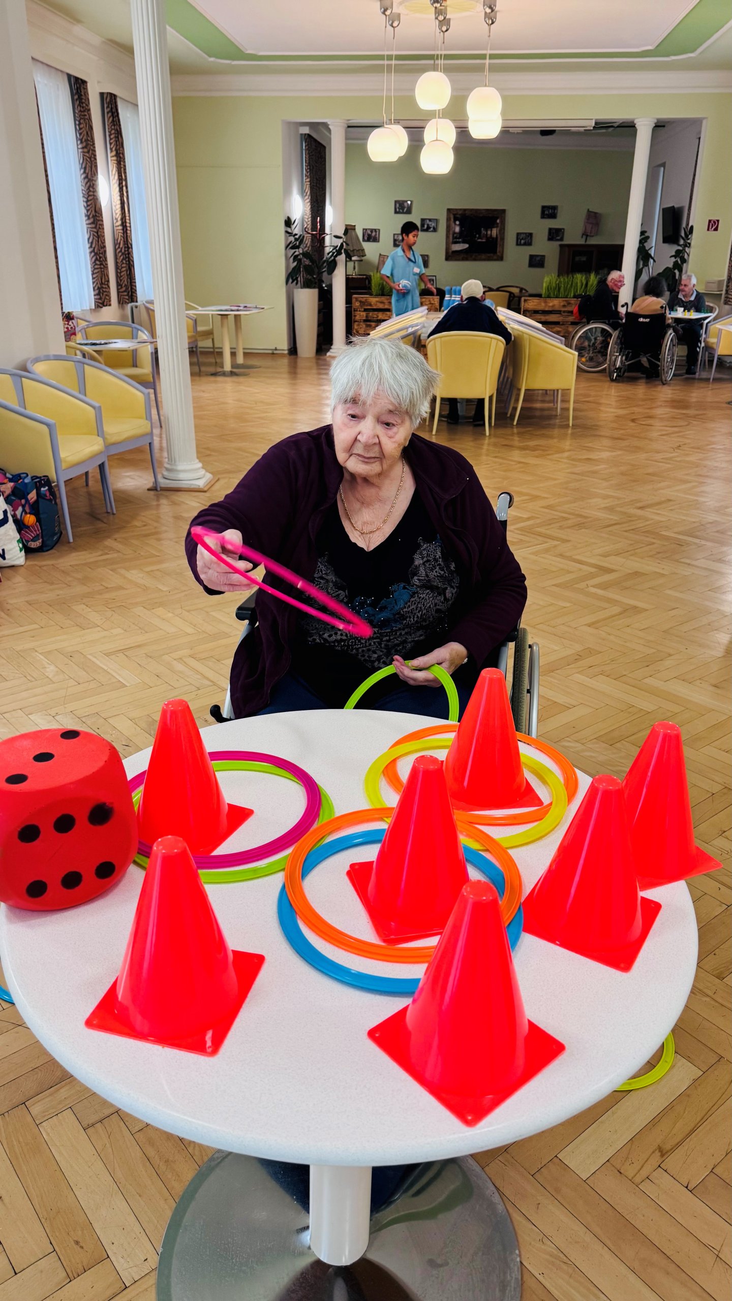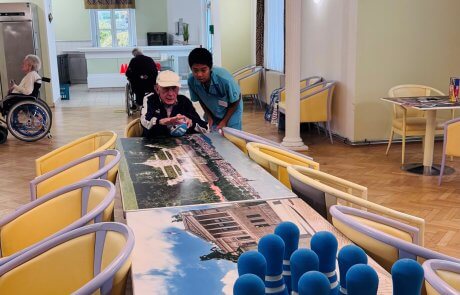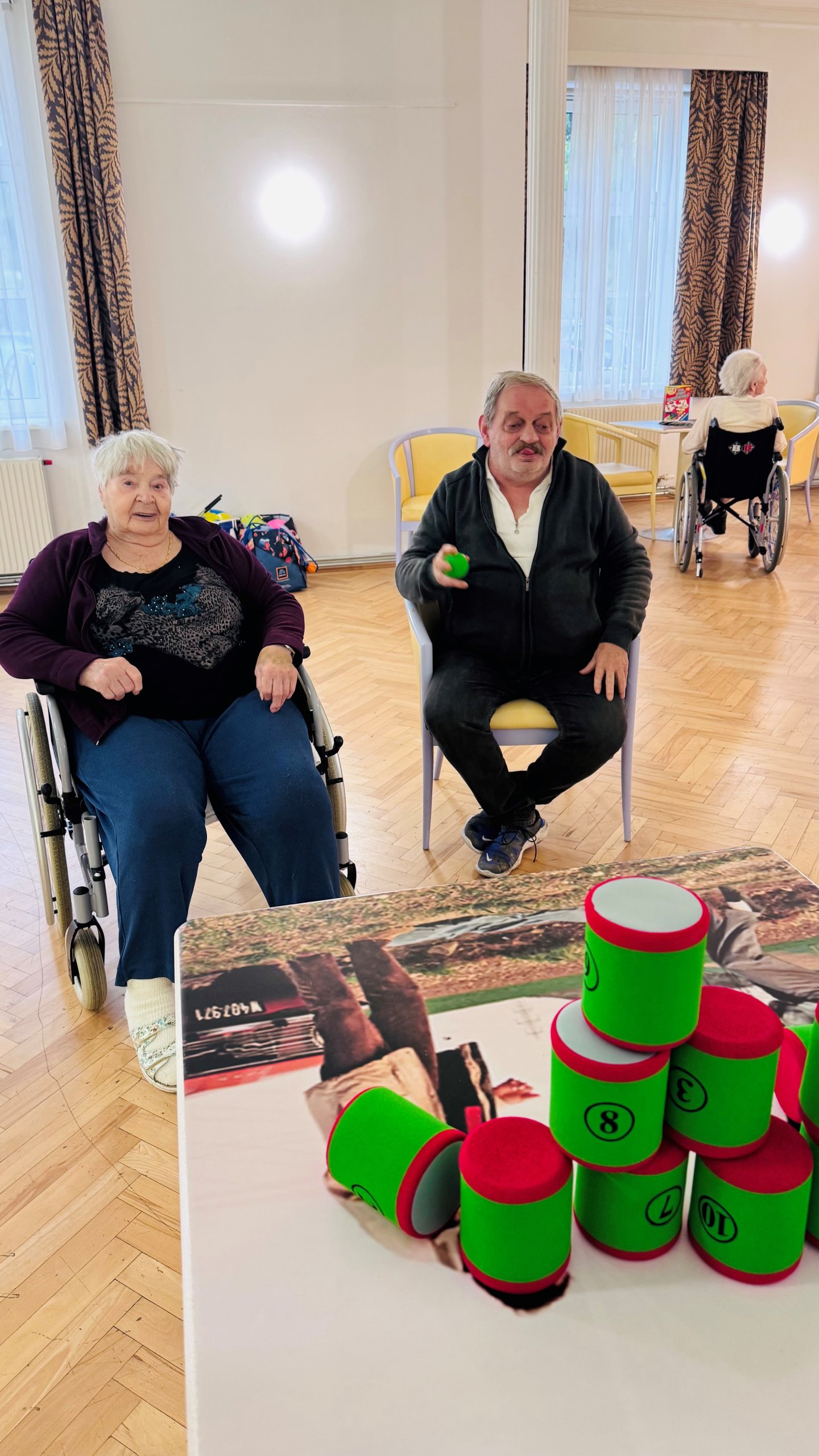 An den zusammengeschobenen Tischen wurde eifrig „gekegelt“ – mit viel Geschick, Jubel und Applaus bei jedem Treffer. Einige Bewohner:innen versuchten sich außerdem im Dosenwerfen, wobei weiche Schaumstofffiguren für sichere, aber ebenso spannende Würfe sorgten.