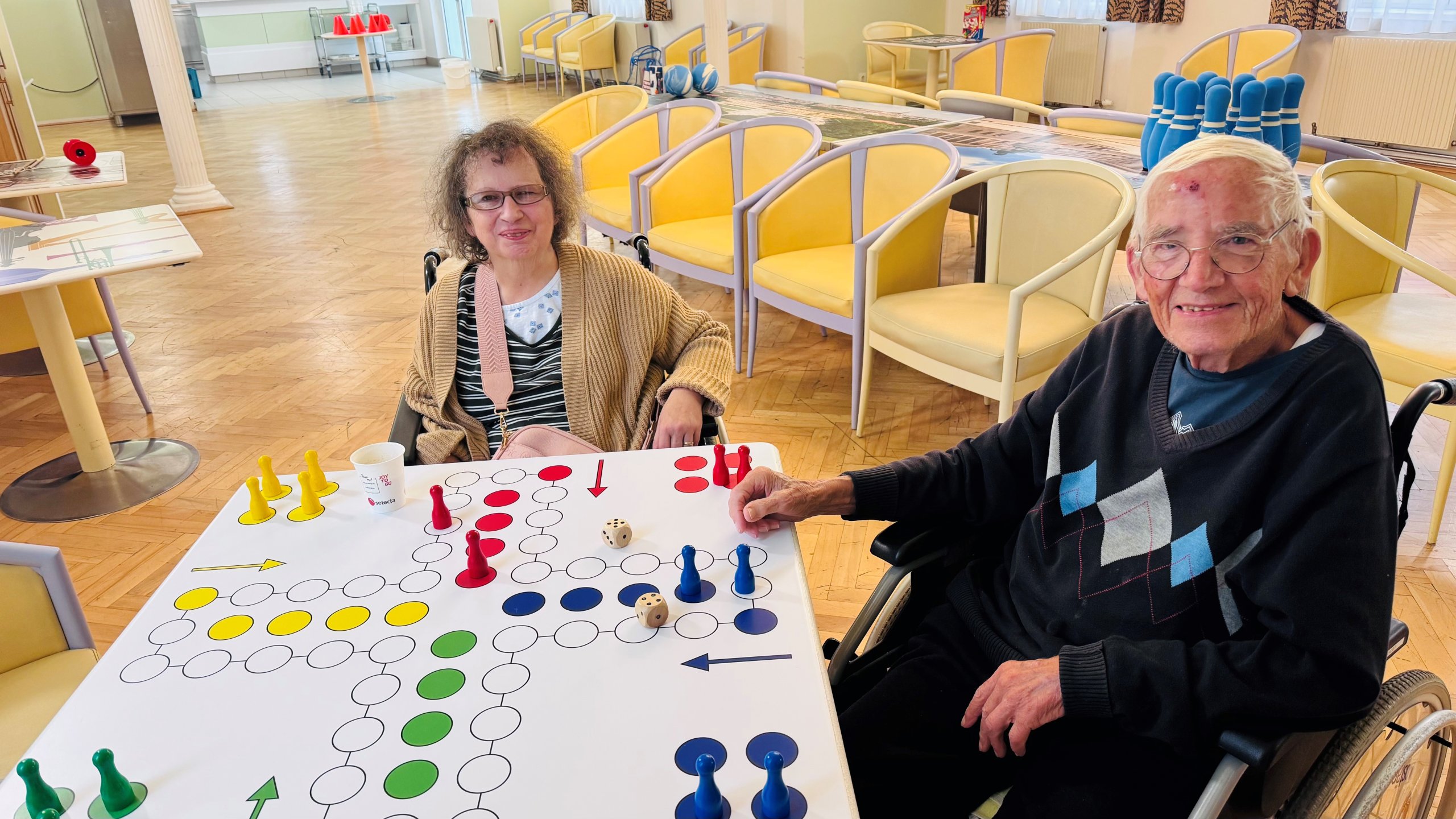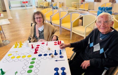 Ein Teil der Bewohner:innen hatte großen Spaß beim „Mensch ärgere dich nicht“-Spiel auf dem extra großen Spielfeld: Mit riesigen Figuren wurde gewürfelt und natürlich auch ein wenig geneckt.