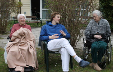 Die Bewohnerinnen plaudern mit dem Zivildiener um die Wette.