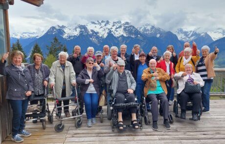 Kaum hatten die Bewohner:innen den Berggasthof erreicht, wurden sie herzlich empfangen. Der erste Programmpunkt war das gemeinsame Genießen der atemberaubenden Aussicht auf die noch leicht verschneiten Berge. Anschließend verwöhnte das Gasthofteam die Gruppe mit einem köstlichen Mittagessen. Nach dem Mittagessen zog es alle hinaus auf die Terrasse, wo sie die Sonne und das Panorama genossen. Ein Gruppenfoto, das die glücklichen Gesichter vor der malerischen Kulisse zeigt, rundete den Besuch ab. Alexander Welte, Leiter des SeneCura Sozialzentrums Herrenried, betont die Wichtigkeit solcher Ausflüge für das Gemeinschaftsgefühl: „Diese Ausflüge sind nicht nur eine willkommene Abwechslung und gesund, sie stärken auch die Verbundenheit untereinander.“ Gegen 14:30 Uhr trat die Gruppe die Rückfahrt an, doch die Freude war noch lange nicht vorbei. Zurück im Sozialzentrum klang der Tag mit Kaffee, Kuchen und einem Glas Wein aus. Solche Ausflüge sind ein wesentlicher Bestandteil des Lebens im SeneCura Sozialzentrum Herrenried, wo die Bewohner:innen nicht nur umfassende Betreuung genießen, sondern auch aktiv und selbstbestimmt am sozialen und kulturellen Leben teilnehmen können. Der nächste Ausflug ist bereits für Juni geplant und wird mit Vorfreude erwartet.