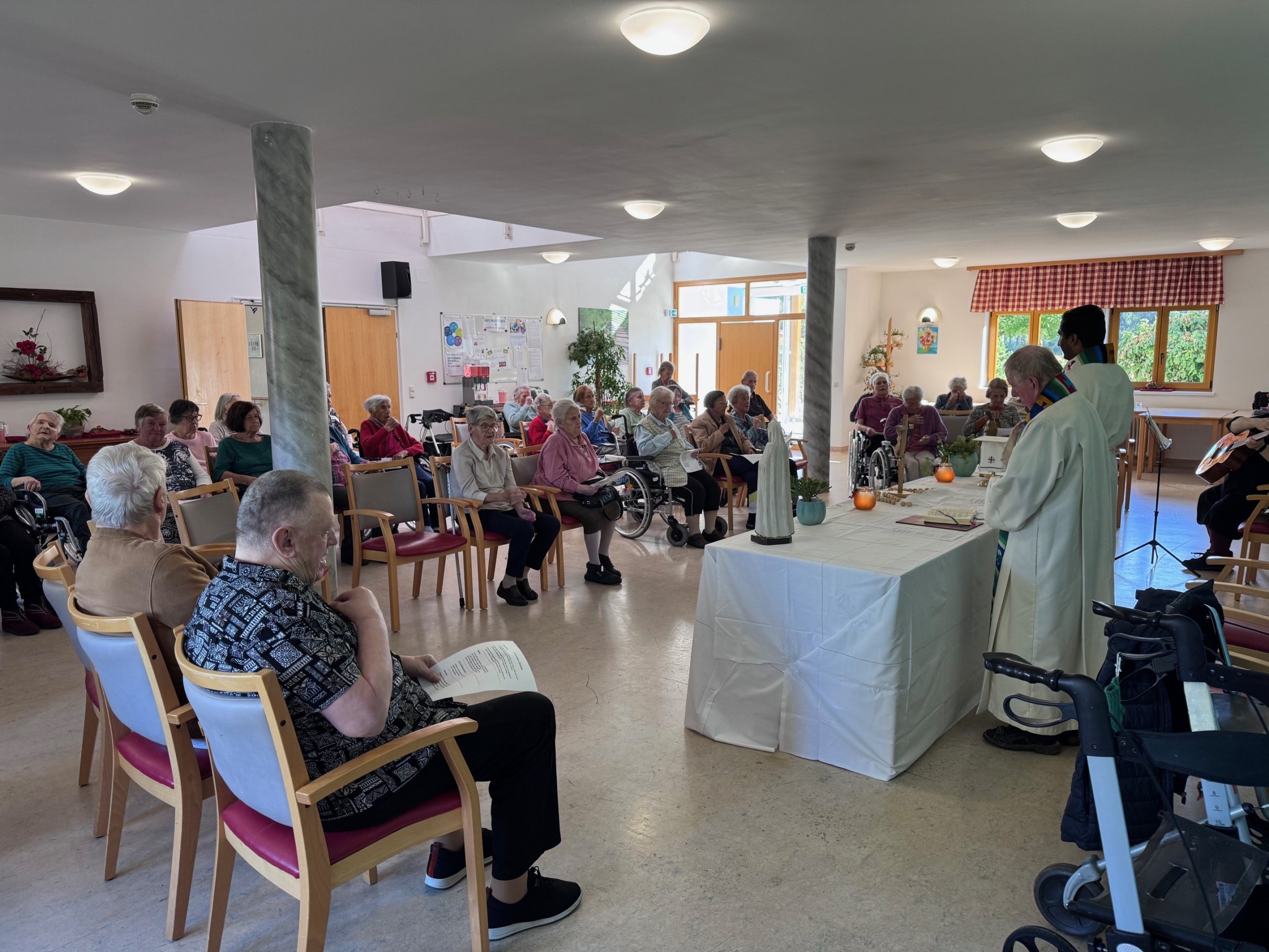 Die Stadtpfarre St. Veit/Glan hat sich kürzlich mit Thomas Wadl, Hausleiter des SeneCura St. Veit/Glan im Haus getroffen und Pfarrer Jinu Joseph Mangalath sowie Kaplan Michael Rossian haben sich bereit erklärt, nicht nur 14-tägig die Heilige Messe bei uns im Haus zu feiern, sondern auch zu den kirchlichen Hochfesten einen Gottesdienst bei uns abzuhalten. Die erste Messe mit unserem Pfarrer wurde nicht nur von Pastoralassistentin Eva Schwarz-Dellemeschnig auf der Gitarre begleitet, sondern auch von „unserem“ Vikar Hans Fercher, der seit 2019 Bewohner im Haus ist und uns immer wieder mit Krankensalbungen oder Gebeten unterstützt. Über 60 Bewohner:innen waren bei der „Premiere“ der Messe dabei. Die Begeisterung war regelrecht zu spüren. Herzlichen Dank an die Stadtpfarre St. Veit für die Möglichkeit unseren Bewohner:innen die Teilnahme an der Heiligen Messe zu bieten.