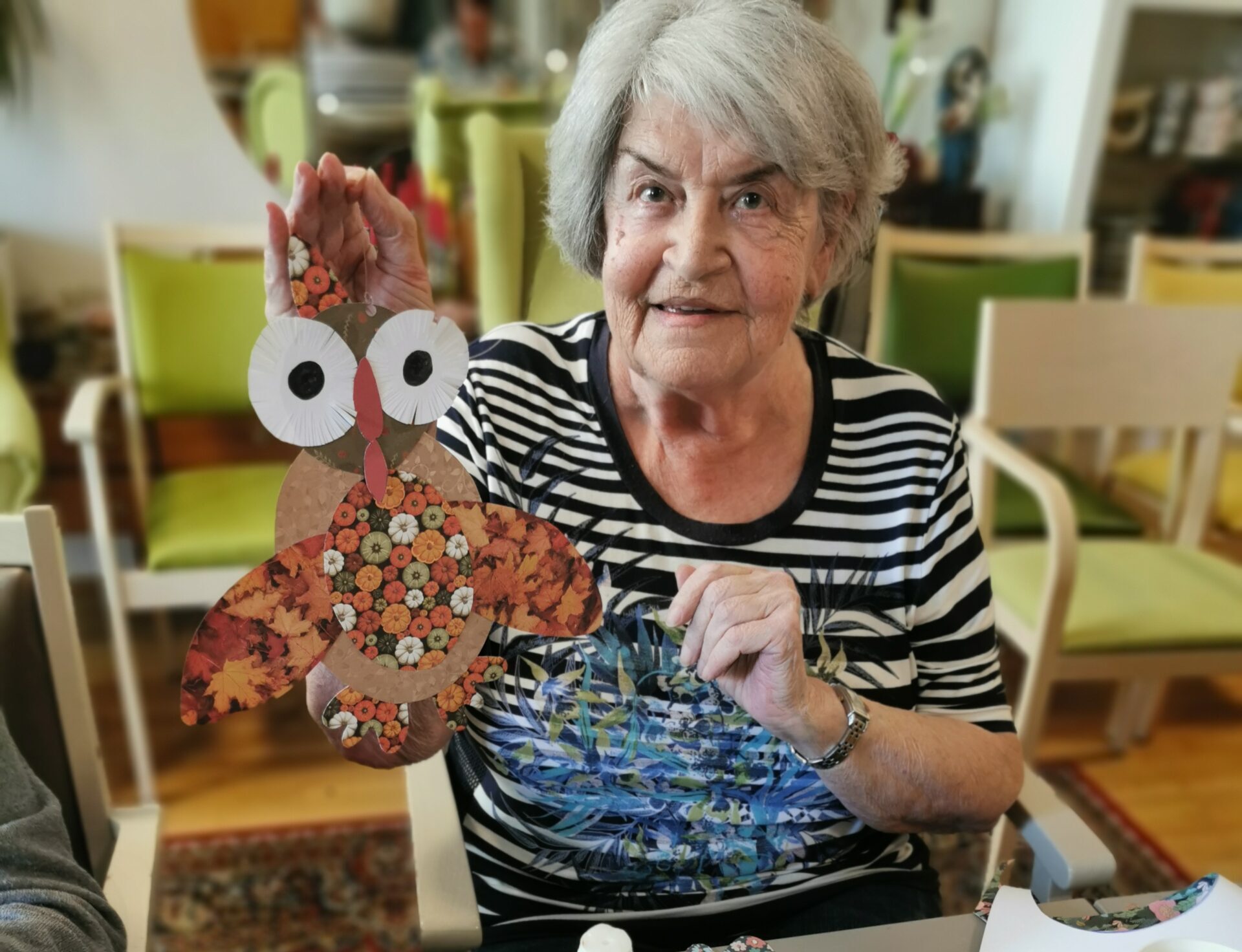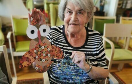 Die Bewohnerin präsentier stolz ihre selbstgebastelte Herbsteule.