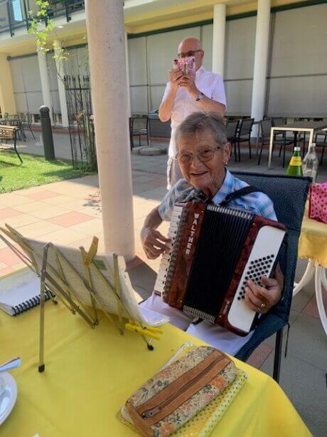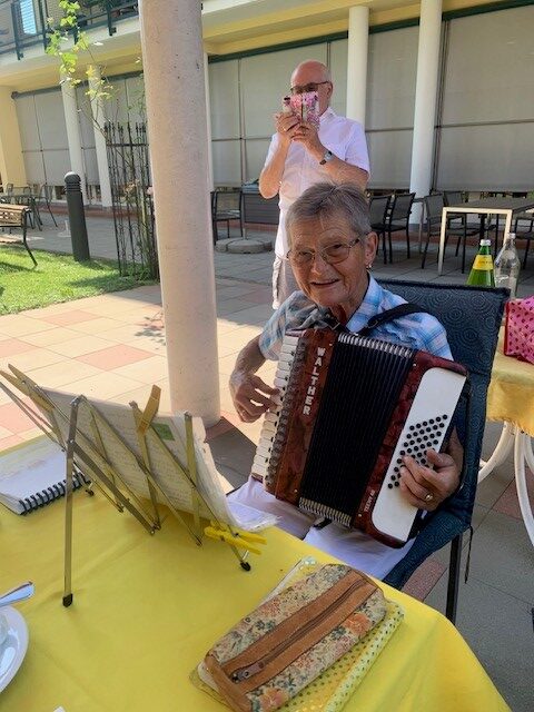 Letztens wurde im SeneCura Sozialzentrum Dornbirn ein besonderer Herzenswunsch von der Bewohnerin Ella Spettel erfüllt. Sie wünschte sich eine ausgiebige Geburtstagsfeier mit ihrer Familie und den Bewohner:innen aus ihrem Wohnbereich. Zu ihrem stolzen 92. Geburtstag wurde dieser Wunsch zur Realität und es wurde ein besonderes Fest für die Jubilarin Ella Spettel organisiert. Das gemütliche Beisammensein wurde von den schönen Liedern, die von der ehrenamtlichen Harmonika-Spielerin Erna zum Besten gegeben wurden, begleitet. Bei strahlendem Sonnenschein war es ein herzliches Gartenfest mit Kuchen, Brötchen und dem ein oder anderen Glas Sekt.