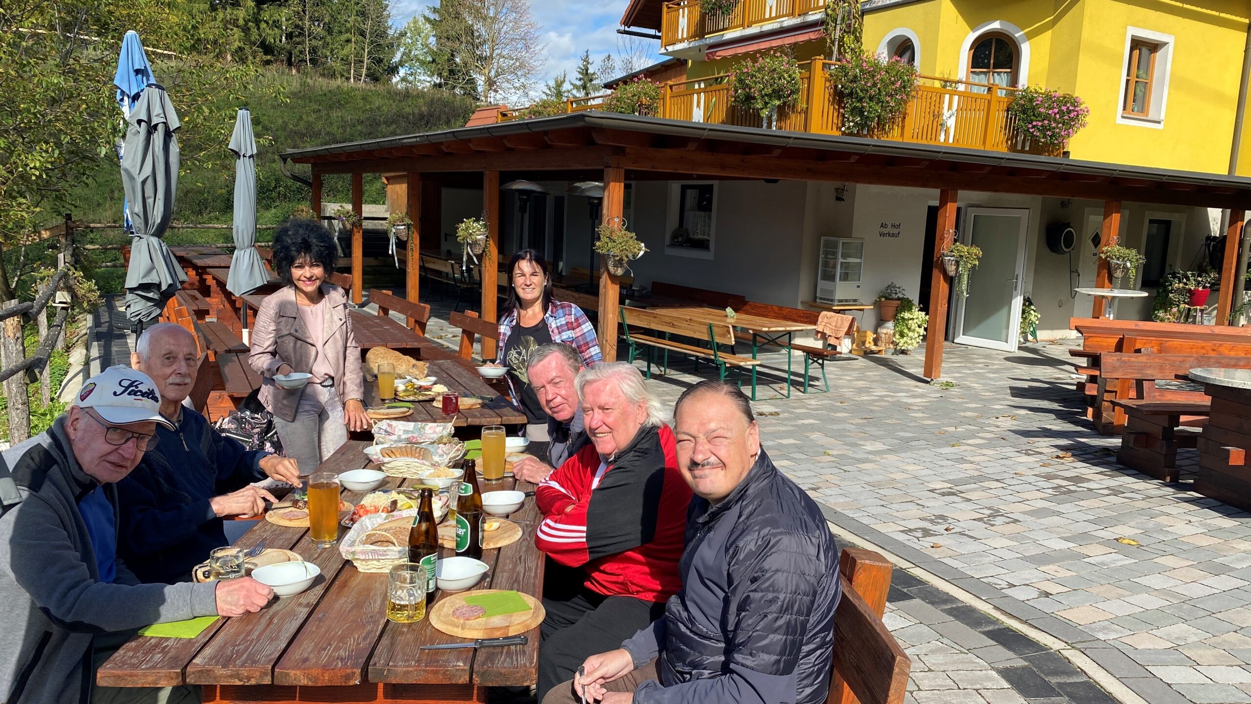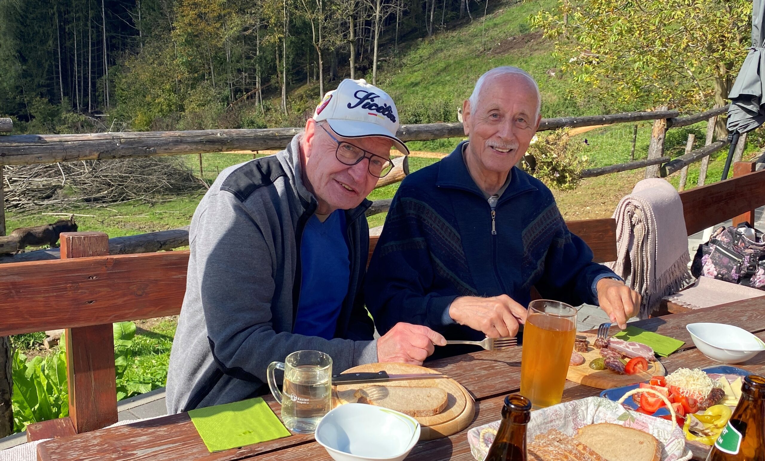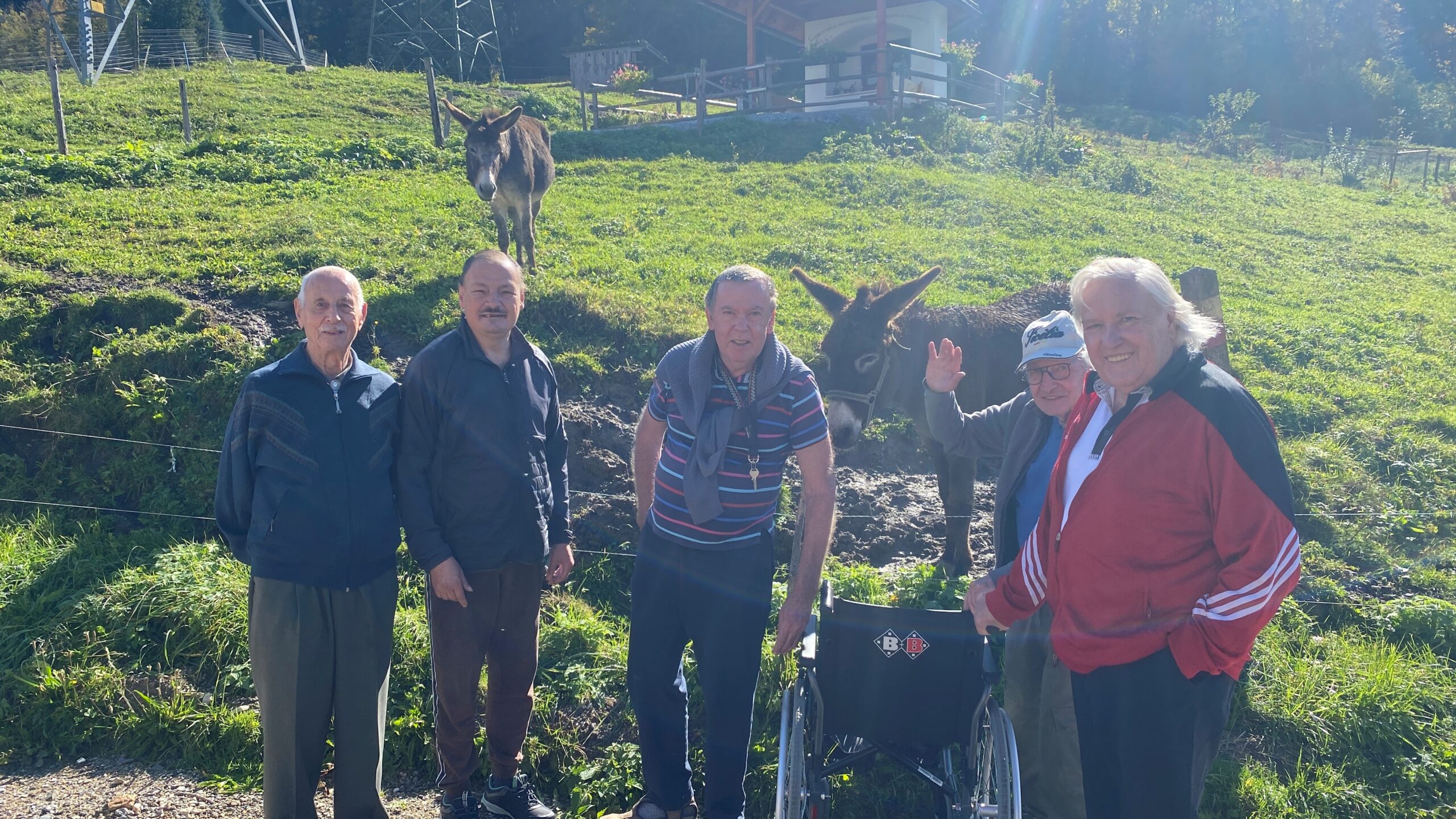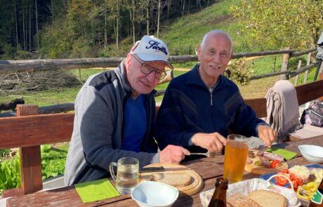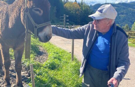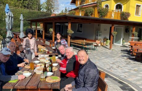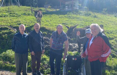 Der Bewohner des SeneCura Sozialzentrums Knittelfeld, Haselsteiner Leopold, ist ein „Genießer“ und liebt es, individuelle Ausflüge zu machen. Dabei darf leckeres Essen und am besten ein frischer Most natürlich nicht fehlen. Herr Haselsteiner kommt ja schließlich aus dem Mostviertel und daher ist der Herzenswunsch, einen Heurigen oder Buschenschenke zu besuchen, naheliegend. Auch der Bewohner, Zeman Friedrich, war immer sehr unternehmenslustig und so schloss er sich dem Ausflugswunsch gerne an. Und da beide Herren sehr gesellig sind, erweiterte sich die Ausflugsrunde kurzerhand noch um drei weitere Bewohner, die sich freuten die Ausflugsgelegenheit zu einer Buschenschenke in den Tollinggraben in St. Peter Freienstein nutzen zu können! Ein Highlight neben Brettlljausn und Most war ein kleiner Streichelzoo vor Ort. Auch das Wetter spielte an diesem