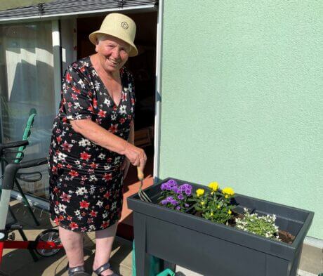 Die Bewohnerin des SeneCura Sozialzentrums Knittelfeld, Zadnikar Hildegard, siedelte unlängst vom ersten Stock in das Erdgeschoss. Dies war ein Wunsch von ihr, da sie so den Zimmer zugehörigen Balkon gegen ein feines „Gartenplatzerl“ eintauscht. Und früher hatte sie zu Hause ja immer einen großen eigenen Garten, wie sie sagt. Weil das Team des Hauses der Bewohnerin eine besondere Freude bereiten wollte, haben sie alle zudem mit einem Hochbeet samt Blumen, eigenem Gartenwerkzeug und einer Gießkanne überrascht. Dies war ein kleiner, aber freudebringender Herzenswunsch, den die Mitarbeiter:innen gerne erfüllten.