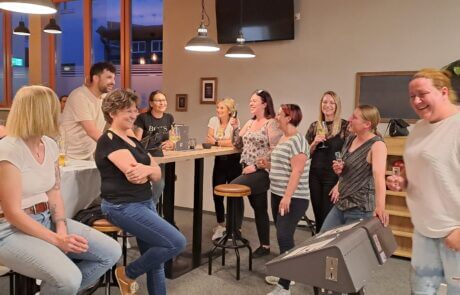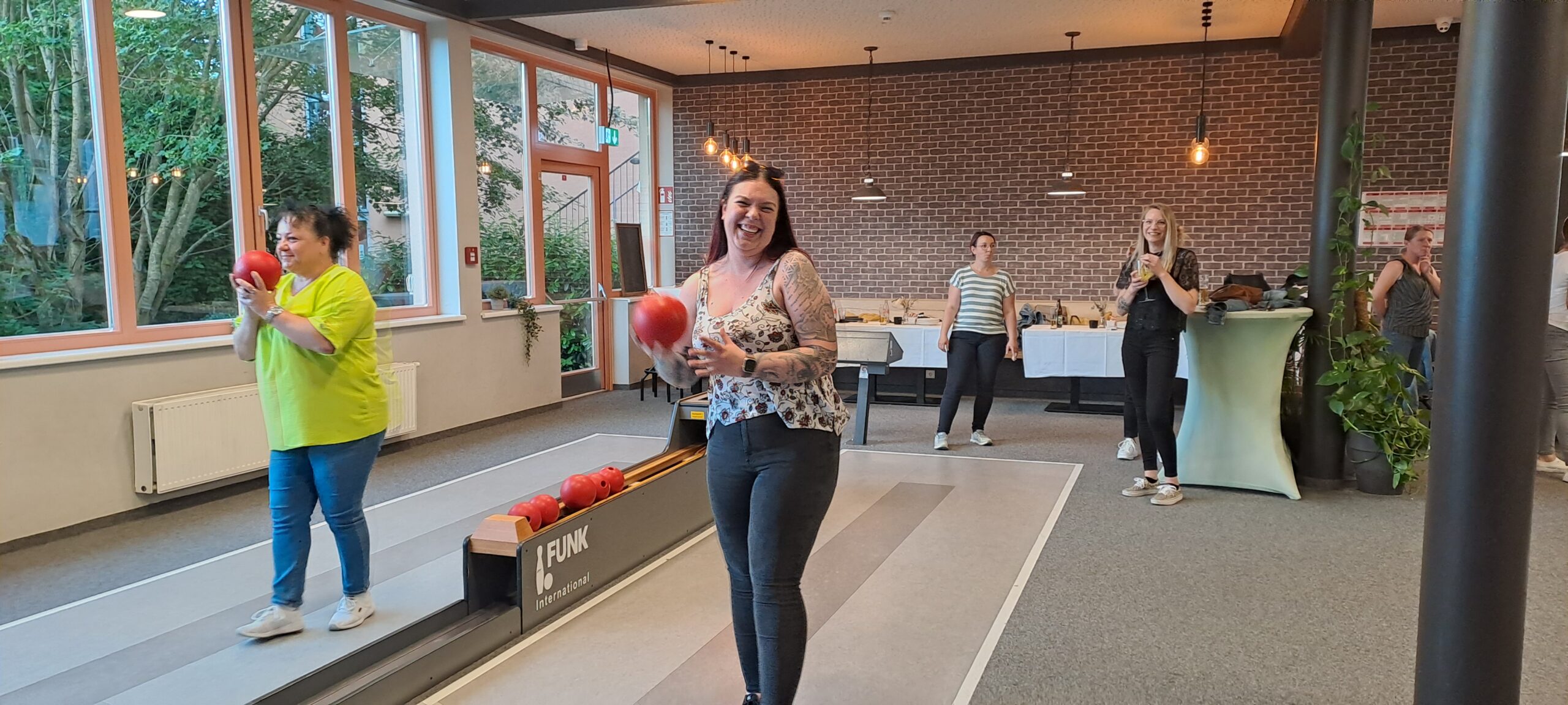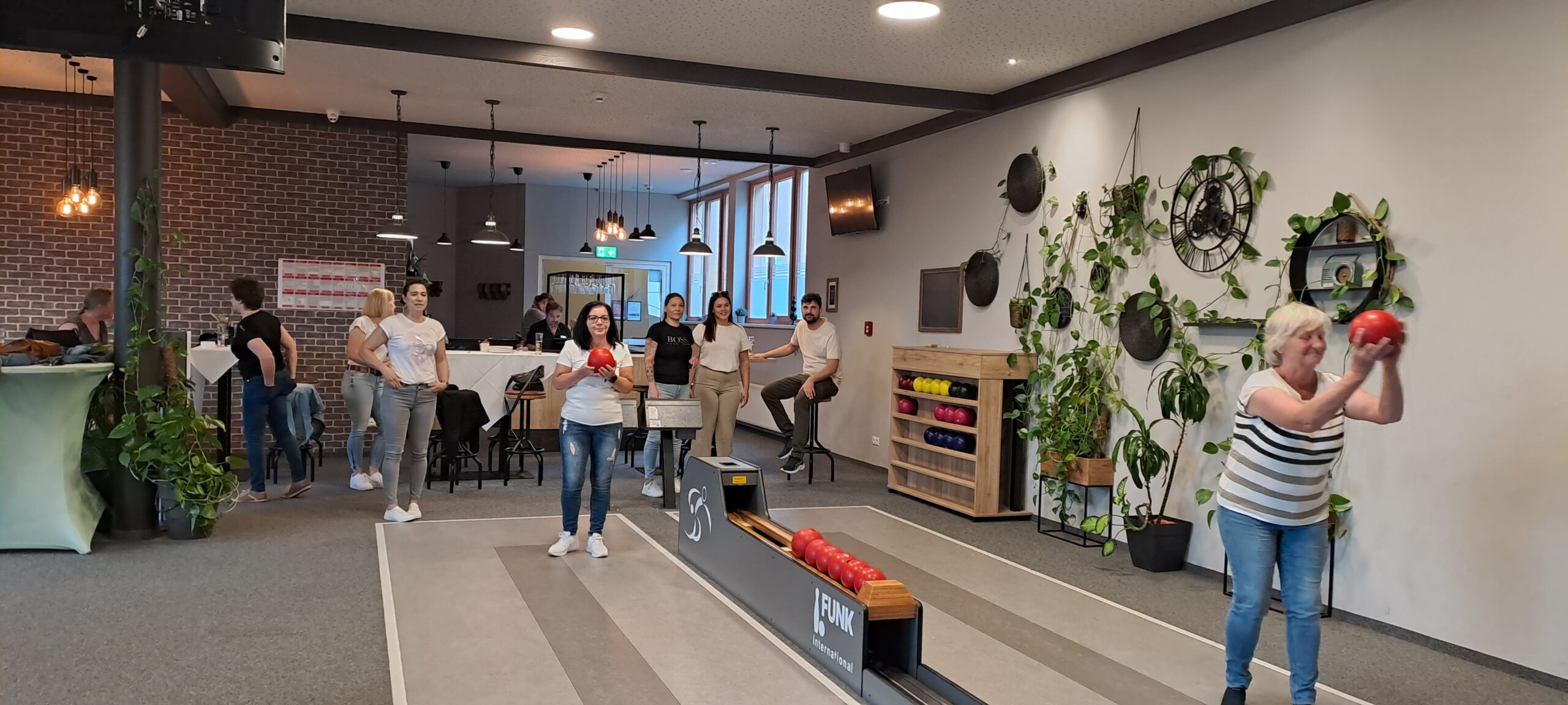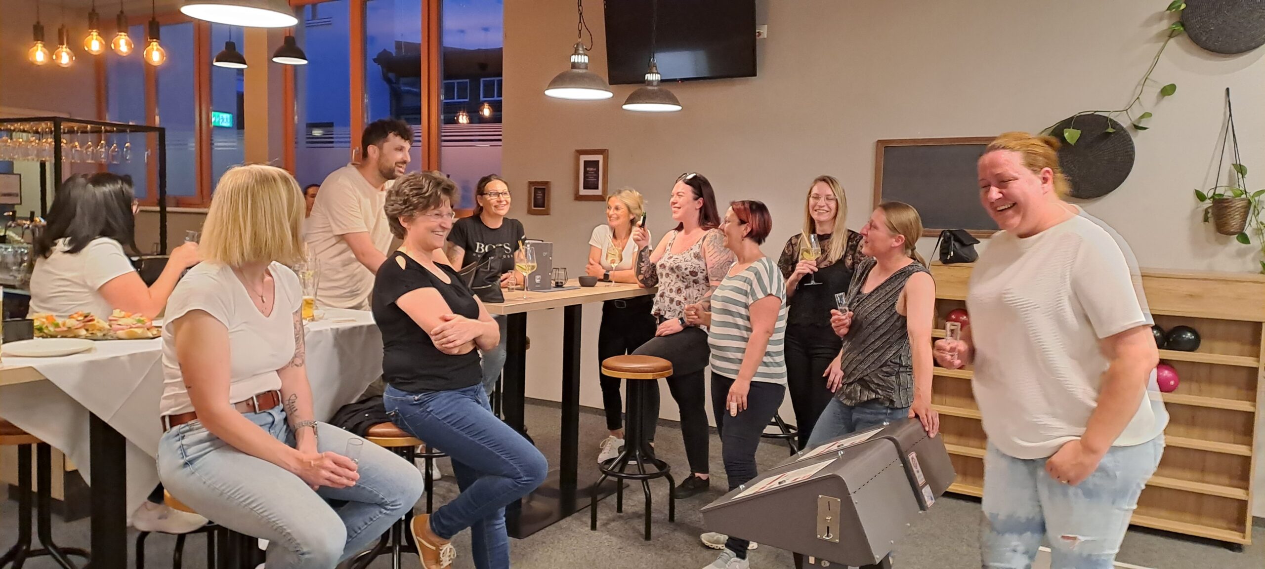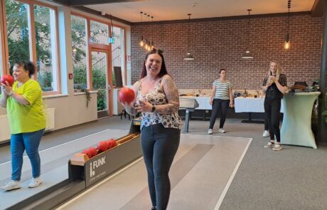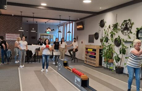 Das Team hat viel Spaß beim Kegelabend.
