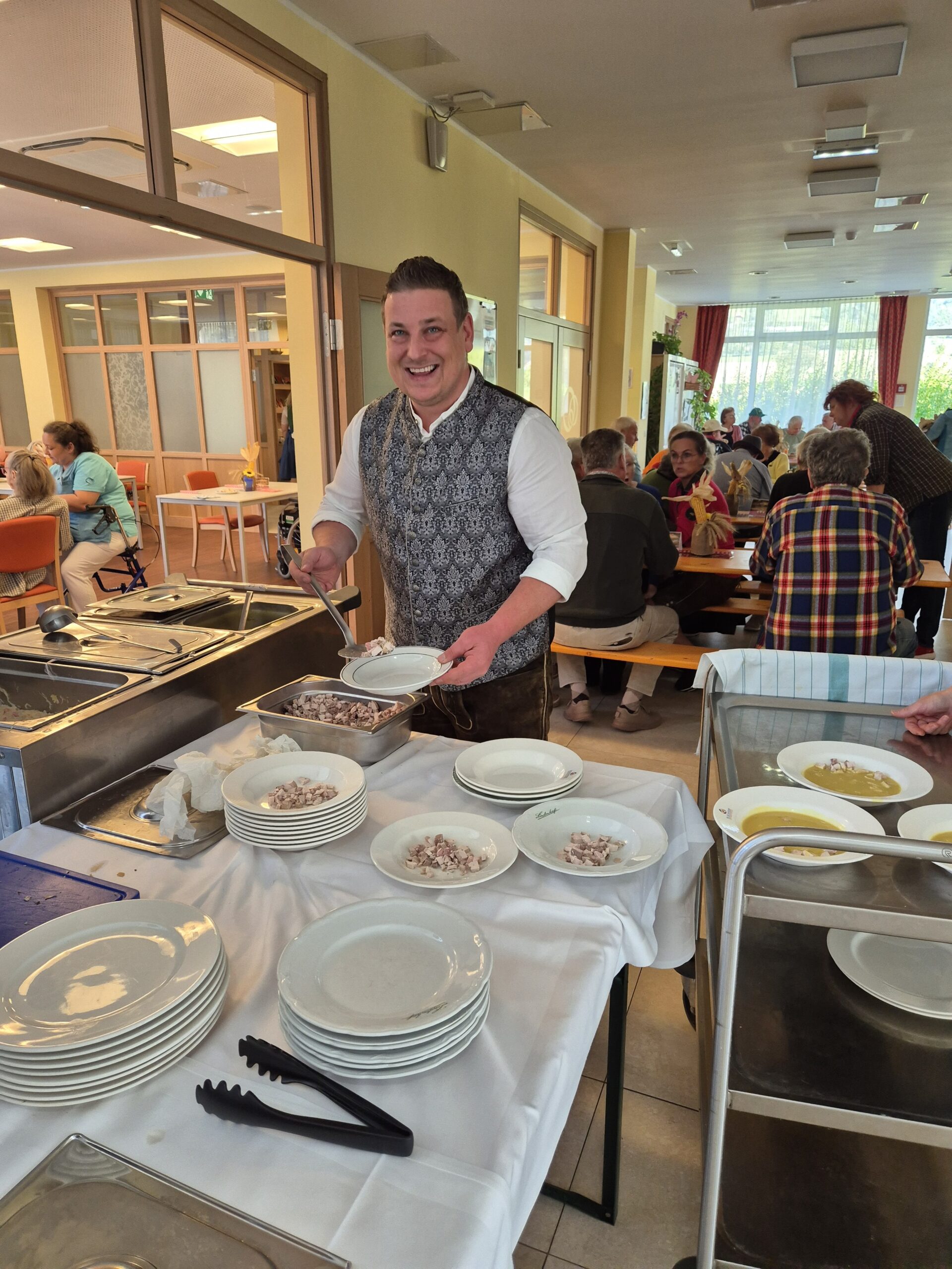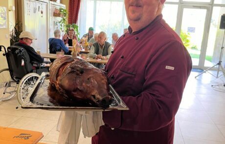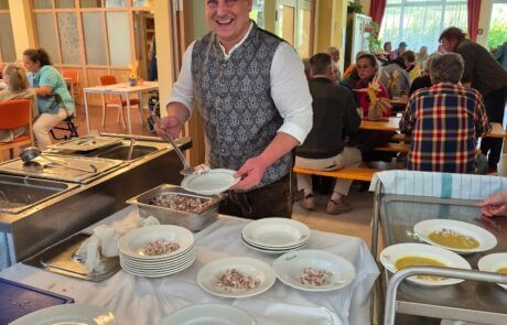 Im SeneCura Pflegezentrum Lurnfeld heißt es kürzlich traditionell: „Ab in Dirndl und Lederhose“. Denn der hauseigene Garten und der Speisesaal verwandelten sich anlässlich des Kirchtags in eine festliche Oase der Gemütlichkeit und Freude. Koch Willi verwöhnte alle mit einem leckeren Spanferkel mit Semmelrolle und Sauerkraut sowie einer Kirchtagsuppe. Hausleitung Roland Risser ließ es sich nicht nehmen und servierte die Köstlichkeiten selbst. Es wurde viel gelacht, getanzt und gesungen. „Ich freue mich jedes Jahr aufs Neue riesig auf den Kirchtag. Einerseits wegen der tollen Stimmung und dem guten Essen, andererseits aber auch, weil ich dann endlich wieder einmal mein Dirndl aus dem Schrank holen kann“, so eine Bewohnerin mit einem Lächeln.