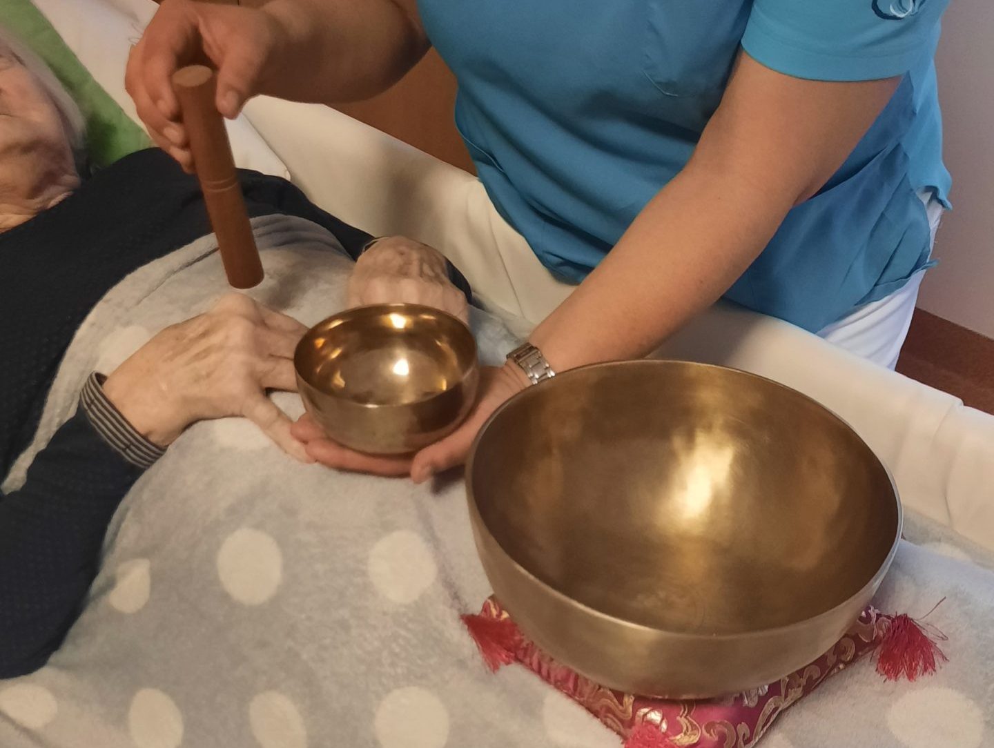Die Pflegeassistentin des SeneCura Sozialzentrums Feldbachs, Maria Edelsbrunner, ist ausgebildete Klangschalentherapeutin und gestaltete kürzlich eine Einheit für die Bewohner:innen des Hauses. Ziel der Klangschalentherapie ist das Erreichen eines Entspannungszustands sowie eine erhöhte Konzentration. Zudem sollen emotionale Blockaden und Verspannungen durch die Therapie gelöst werden. Der Klang kann mit seiner Vibration für geistiges und emotionales Wohlbefinden sorgen.