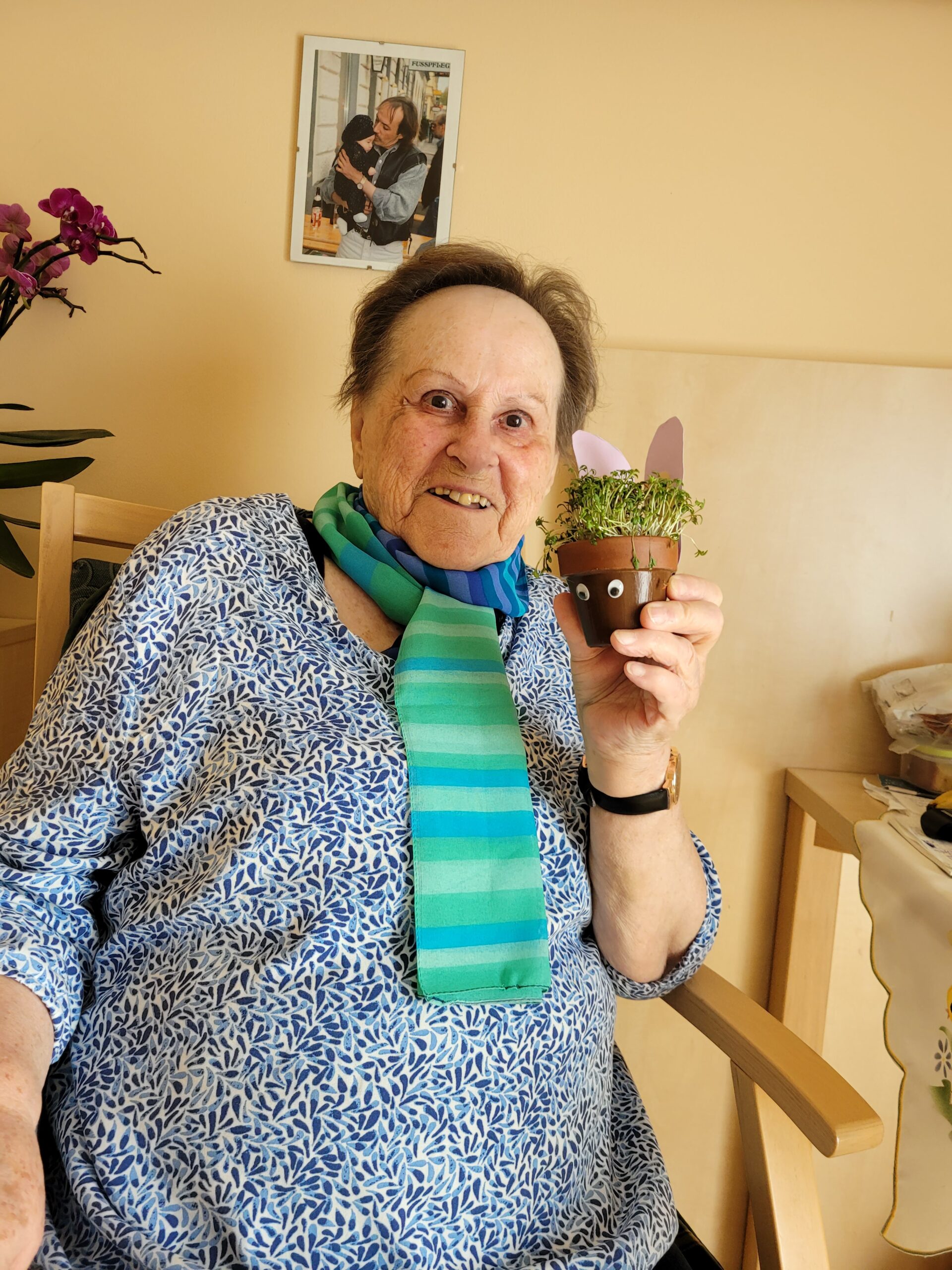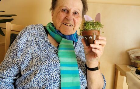 Ernestine Czirbuss mit den selbstgebastelten Kressehasen, welche zur Tischdeko dienten.