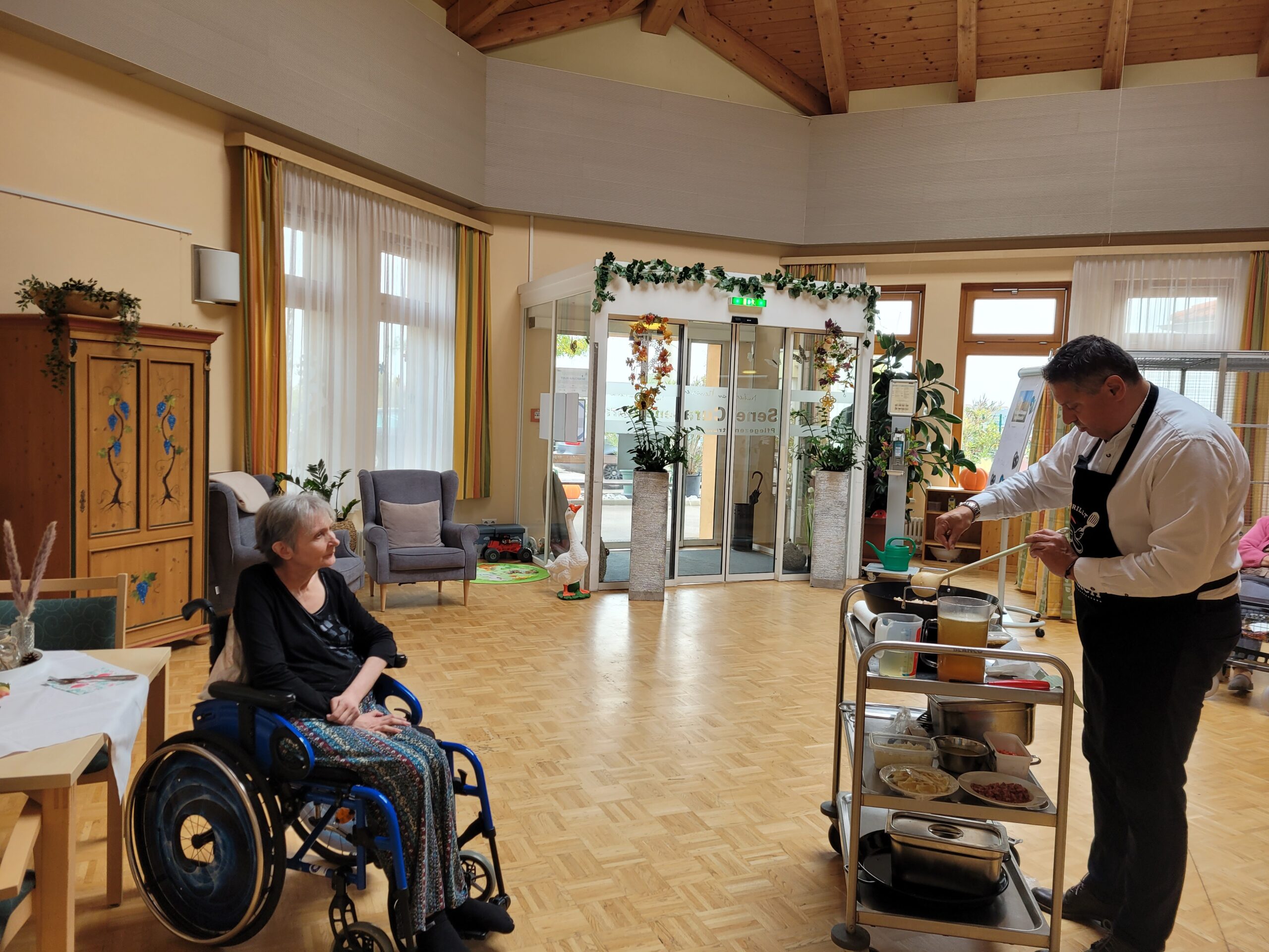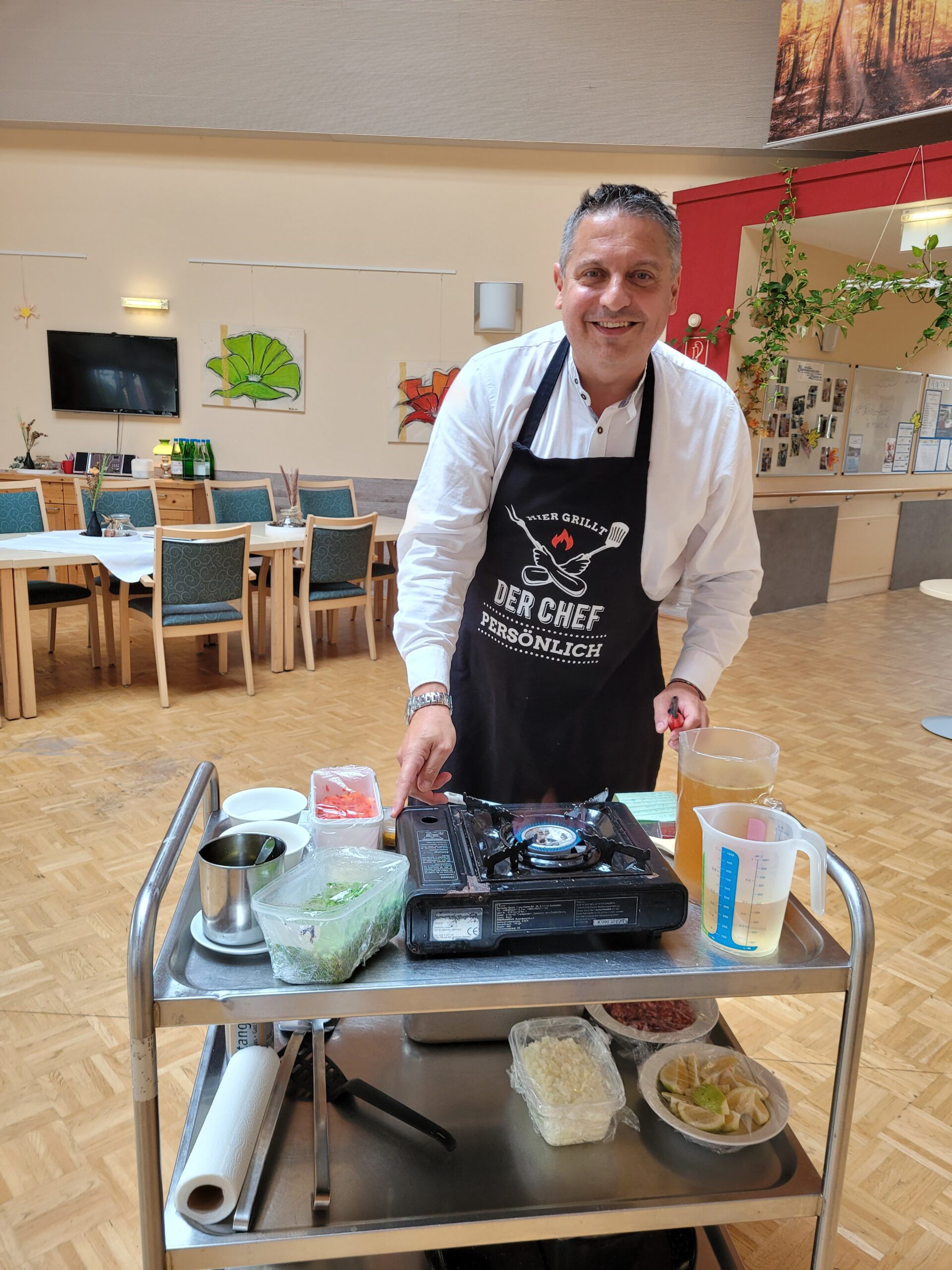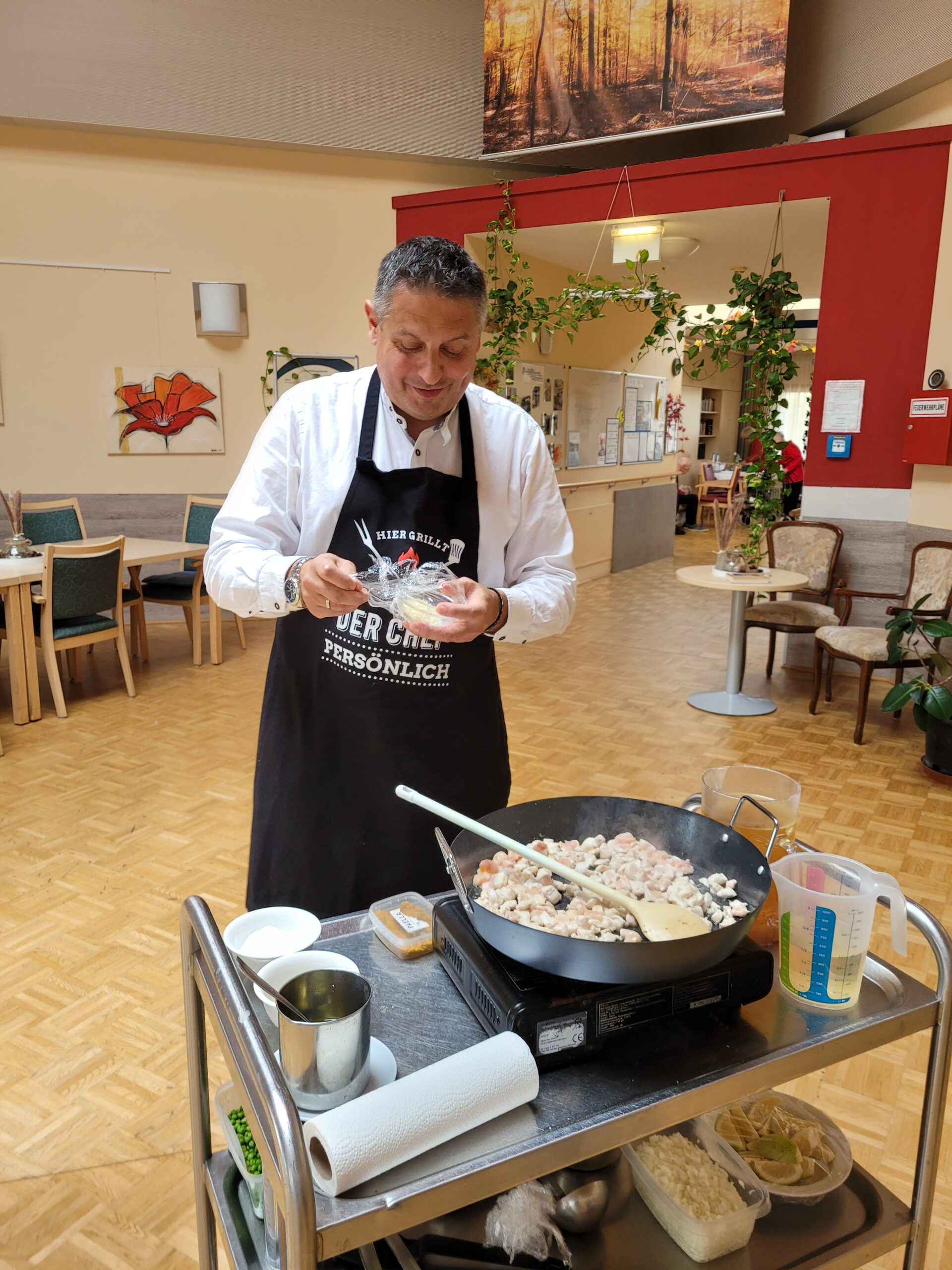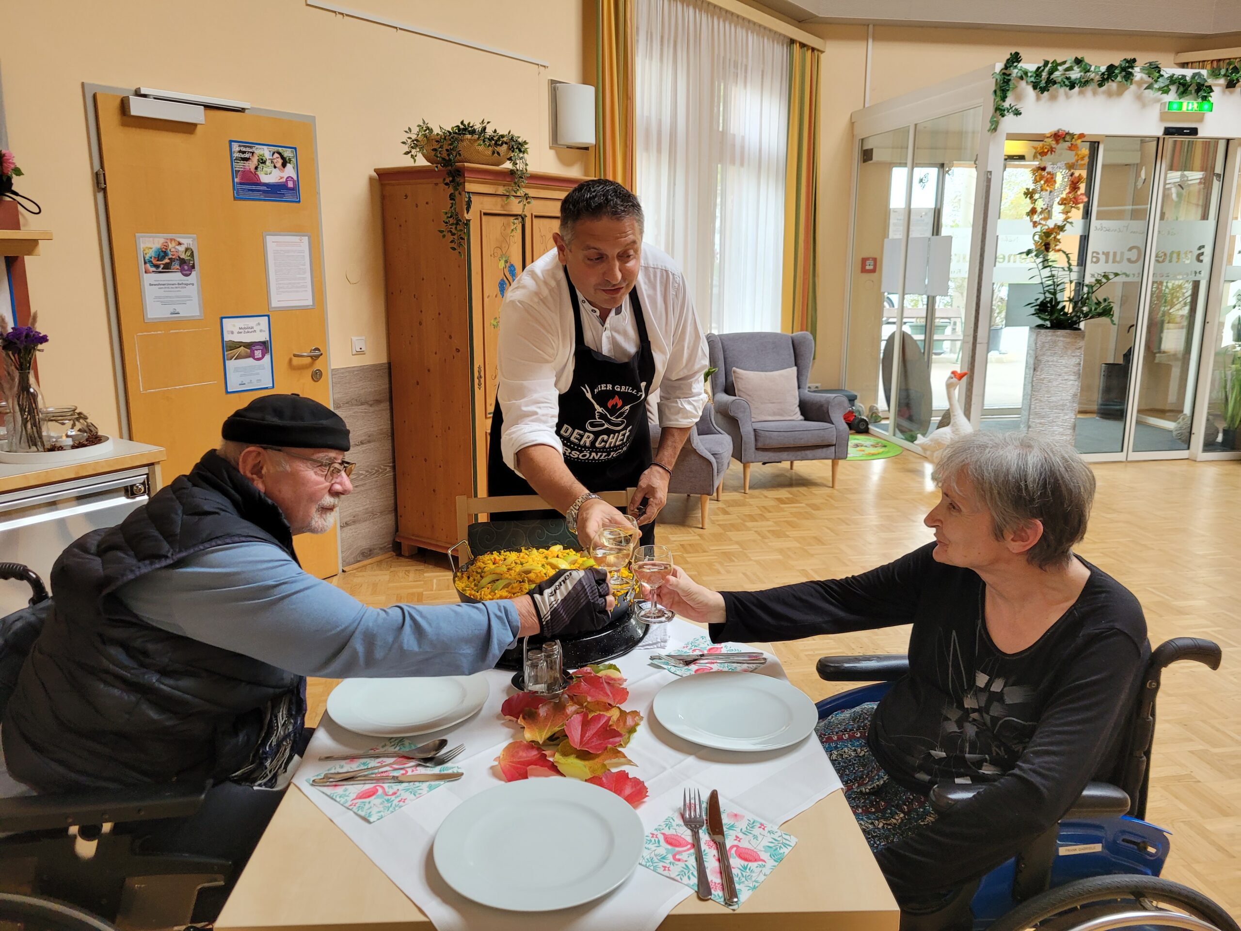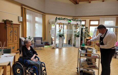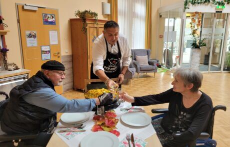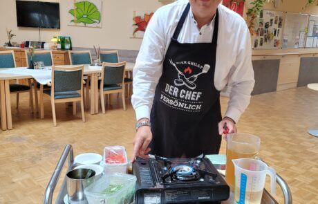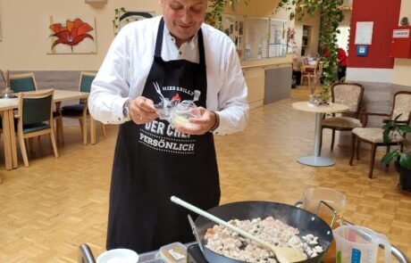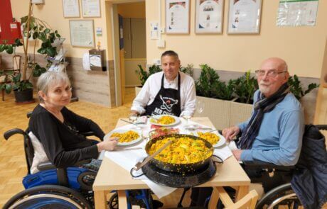 Im Rahmen der Aktion „Herzenswunsch“ hat sich die Bewohnerin des SeneCura Sozialzentrums Rust, Gabriele Frank, eine klassische Paella mit Meeresfrüchten gewünscht. Das hat sich die Hausleitung, Gerald Krenn, nicht zweimal sagen lassen und organisierte alles für die spanische Spezialität. Herr Krenn meinte, dass er die beste Paella macht und wagte sich mit diesen Worten an das köstliche Gericht. Gemeinsam mit Peter König wurde ihm beim Kochen gespannt zugeschaut. Als die Paella fertig war wurde im Anschluss gemeinsam gegessen und ein dazu das ein oder andere Gläschen Wein getrunken. Frau Frank hat sich sehr über die kulinarische Überraschung der Hausleitung gefreut und genoss die leckere Paella in vollen Zügen.