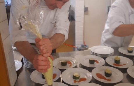 Ein fünfgängiges Menü wurde von Küchenchef Heinz Oswald sorgfältig zusammengestellt und mit seinem Team für unsere Gäste auf den Punkt zubereitet. Den Anfang machte die Vorspeise Roastbeef-Röschen auf gebuttertem Toastbrot an Rucola- Spinatsalat und frittiertem Sesam-Ei. Als Suppe gab es eine Bärlauch-Cremesuppe mit Röstbrot und darauf folgte der Zwischengang herzhafte Zucchinitürmchen mit gebratenem Schafkäse. Zur Auswahl der Hauptspeise gab es entweder Zweierlei vom steirischen Jungschwein mit Austernpilzen und Wildreis oder ein Lachsfilet mit Prosecco-Schaum auf Gemüsebeet und heurigen Kartoffeln. Den Süßen Abschluss machte die Dessertvariation Dreierlei Schokomousse mit frischen Früchten.