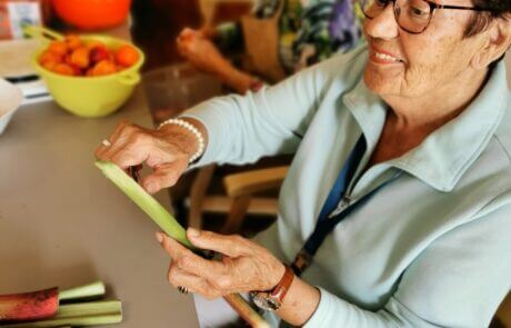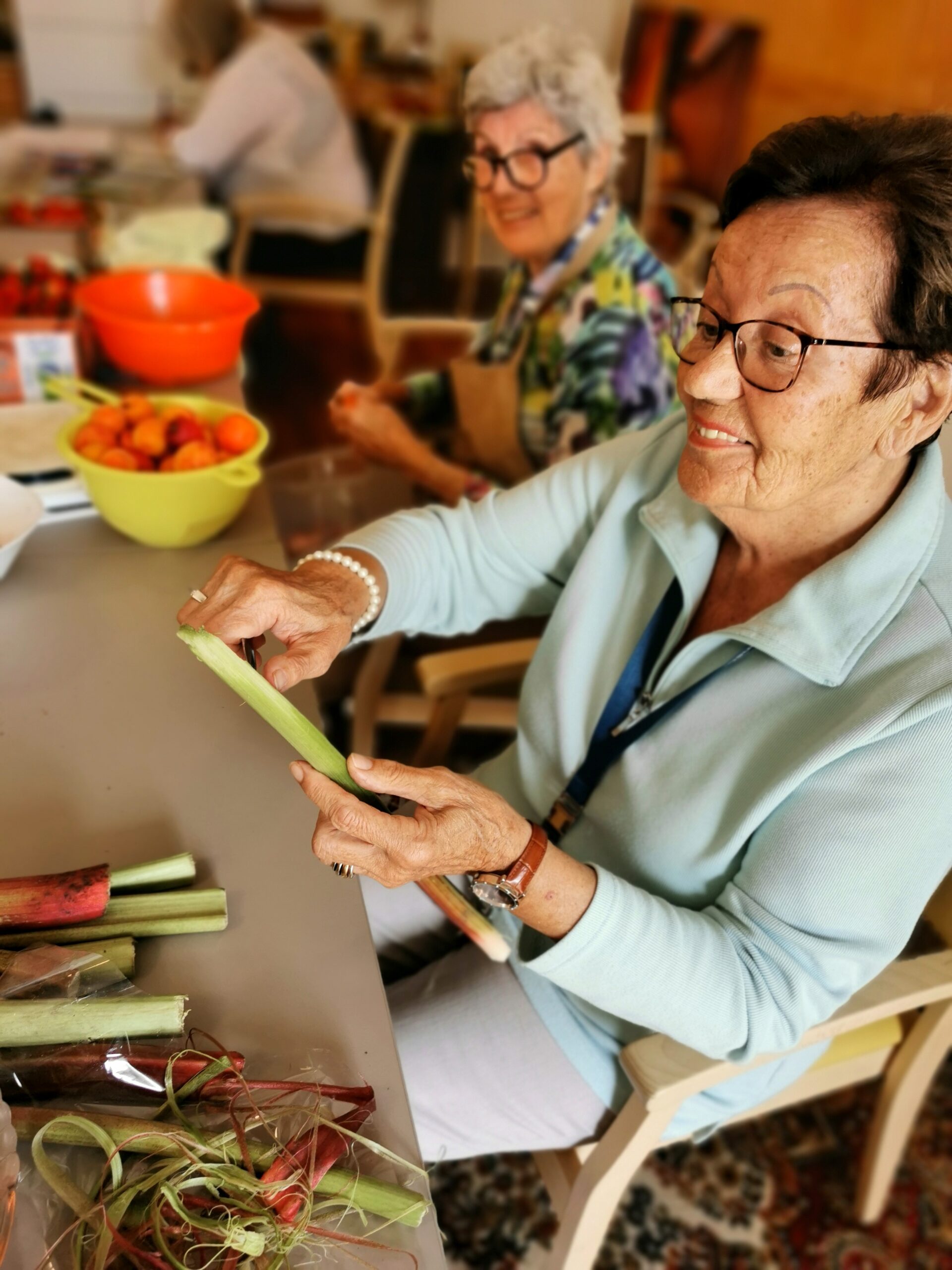 Die Bewohner:innen schnibbeln fleißig Erdbeeren und Rhabarber.