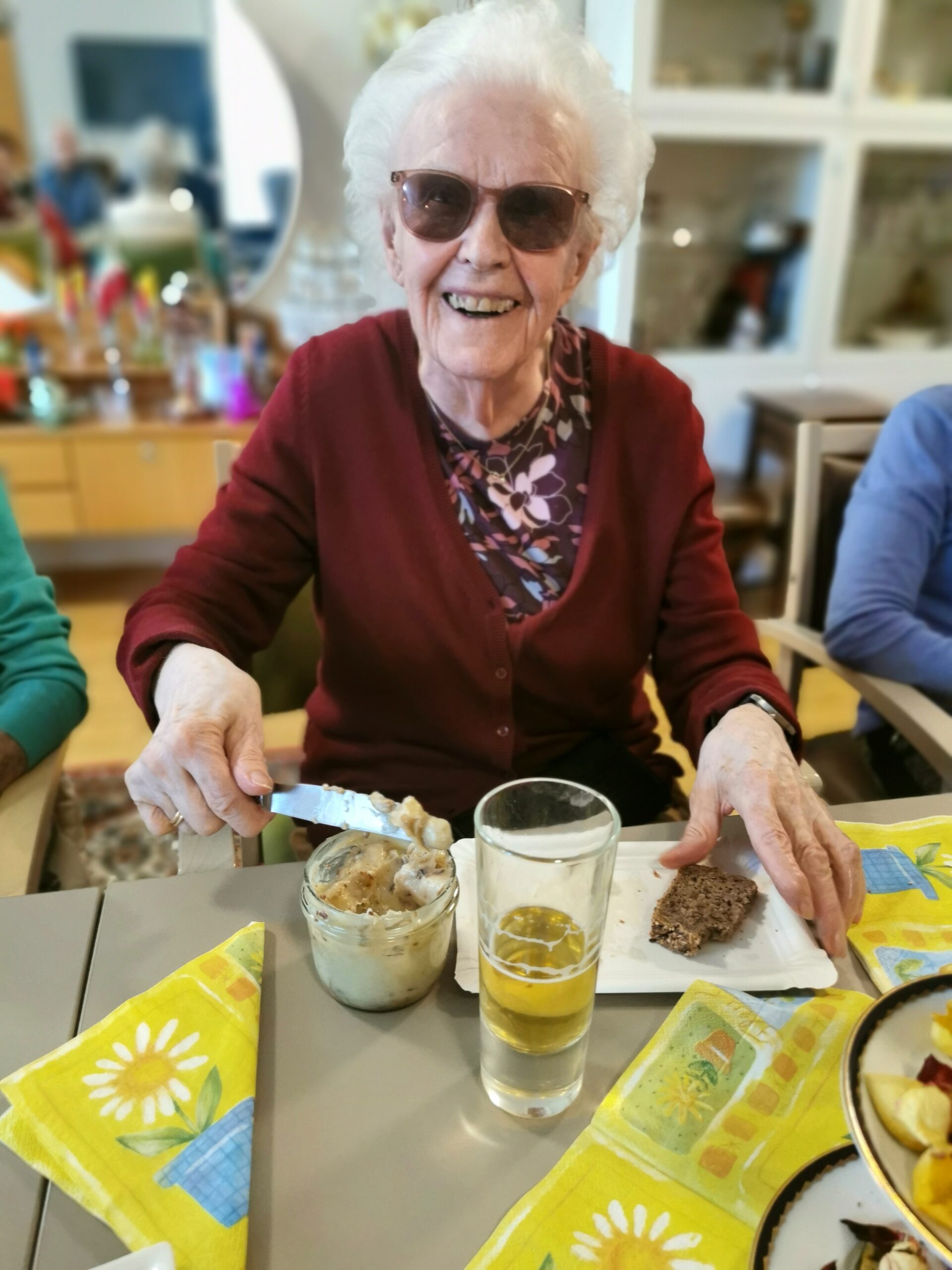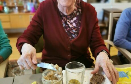 Bewohnerin Croce Anna lässt es sich bei frischem Brot und Aufstrichen so richtig schmecken.