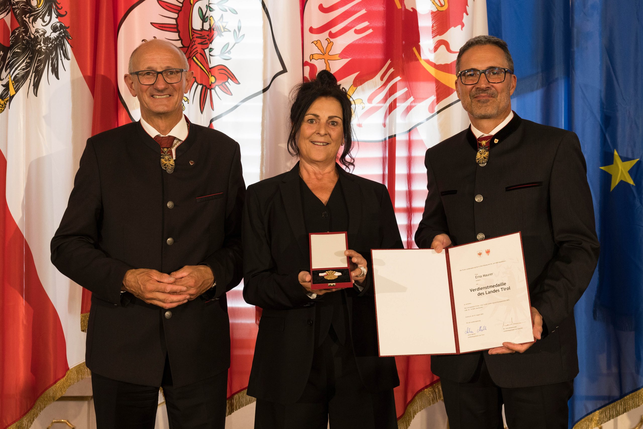 Am 15. August, dem Hohen Frauentag, an dem Tirol und Südtirol traditionell den Blick auf Menschen, die mit ihrem Einsatz das Leben anderer bereichern und das gesellschaftliche Miteinander stärken, war es dann soweit: in feierlichem Rahmen in der Kaiserlichen Hofburg zu Innsbruck würdigten Landeshauptmann Anton Mattle und Südtirols Landeshauptmann Arno Kompatscher heuer 103 Personen mit der Verdienstmedaille des Landes Tirol, und eine davon war Erna Maurer.