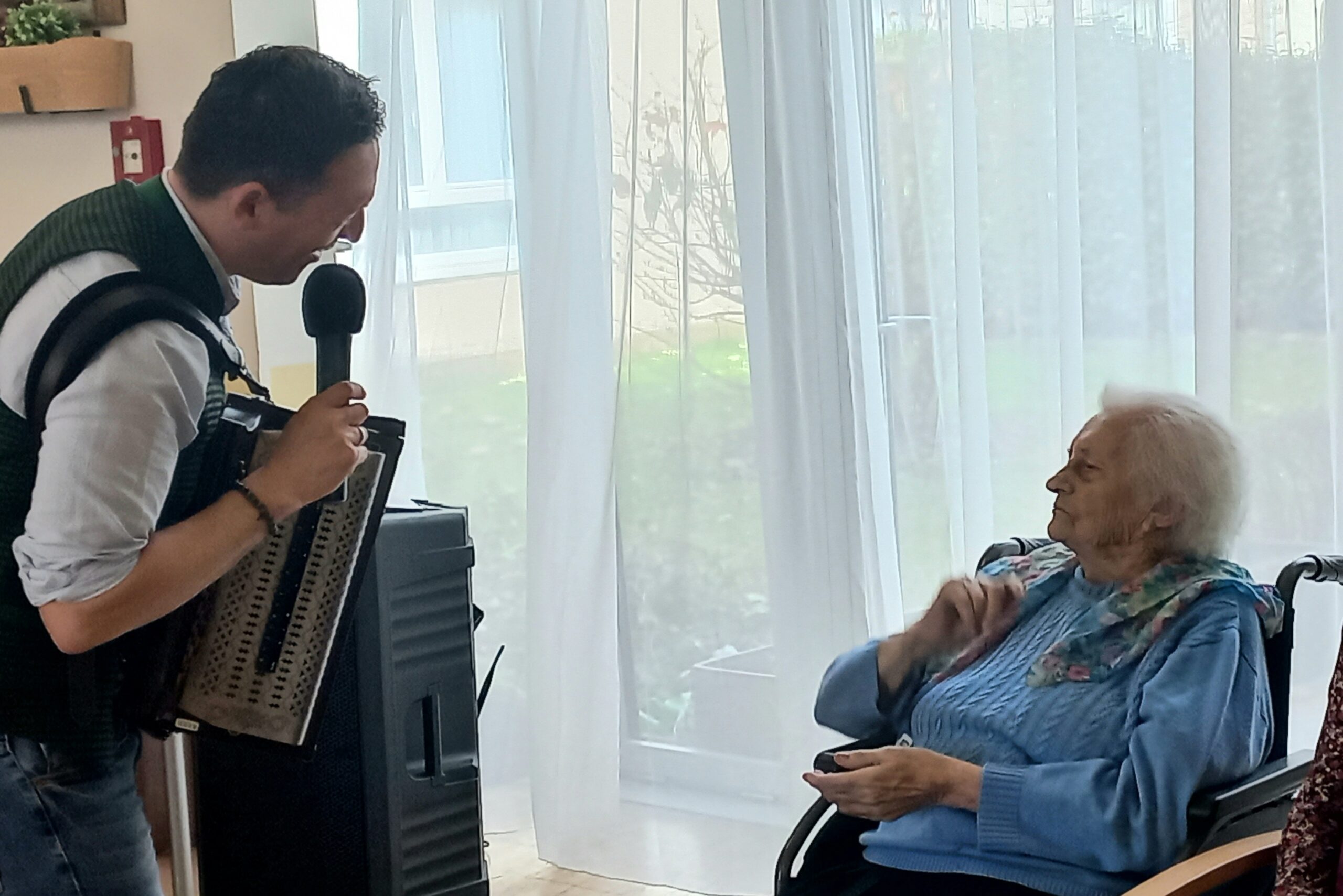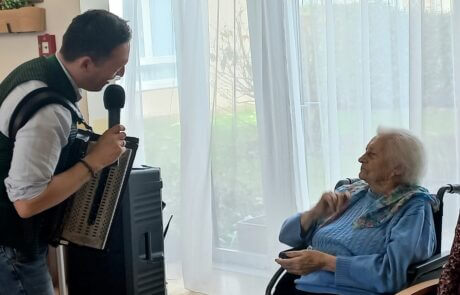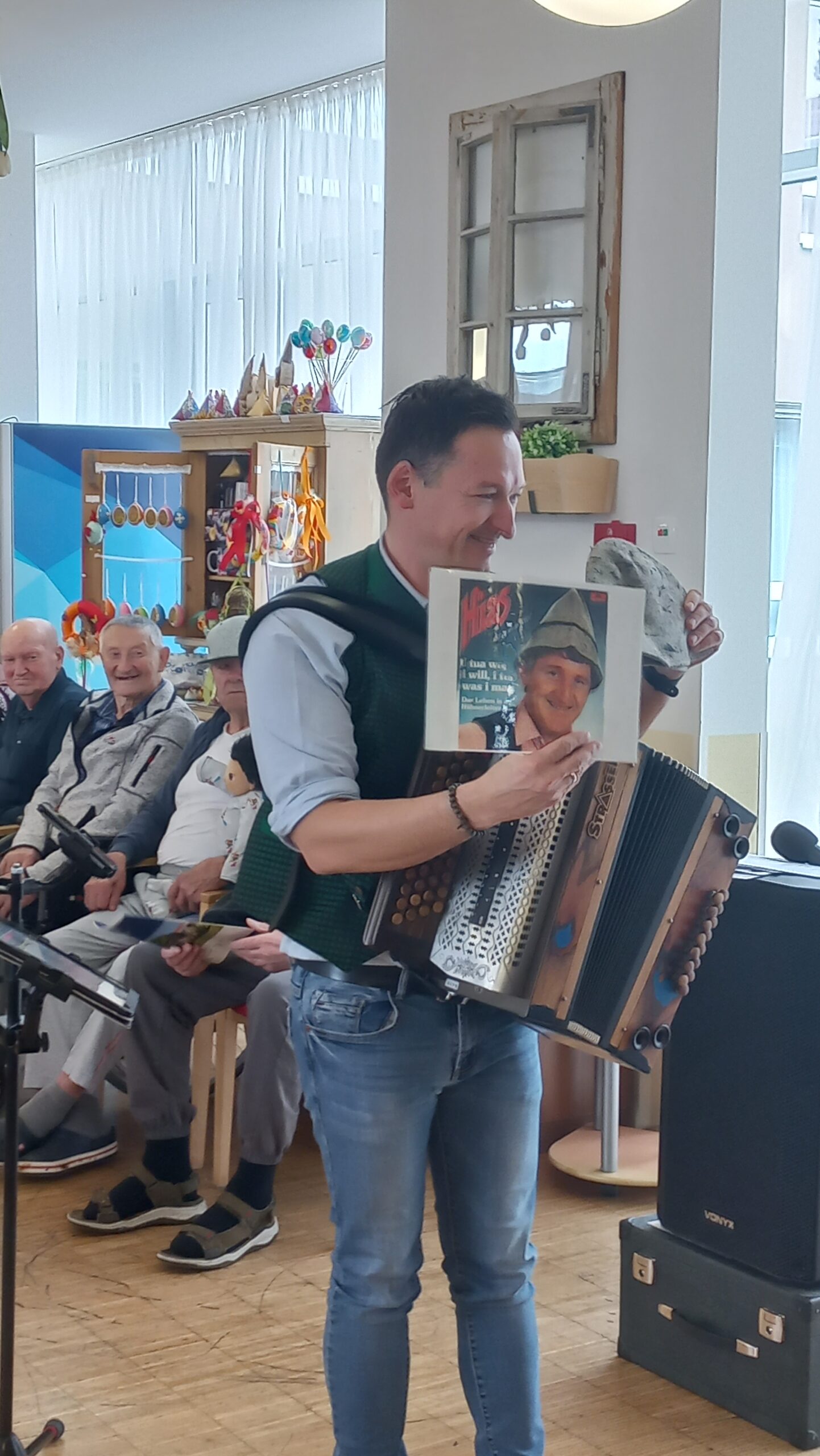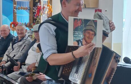 Am Donnerstag hatten die Bewohner:innen des SeneCura Sozialzentrums Stainz einen ereignisreichen Tag. Am Vormittag gab es einen Musikworkshop mit Christian Gruber. Der erst Weg führte ihn zu Bewohnerin Klug Aloisia ins Zimmer, sie sagte: „Der Christian ist mein Liebling und die steirische Musik ist mir das Allerliebste.“. Danach ging es in die Gruppe, wo sich bis zu 50 Bewohner:innen einfanden. Bei der flotten steirischen Musik ließen es sich so mache Bewohner:innen nicht nehmen, das Tanzbein zu schwingen und andere sangen aus voller Kehle zu den Klängen der Harmonika. Eine lustige Parodie vom bekannten „Hias“ (Erich Mathias Mayer) brachte alle zum Lachen. Doch rhythmische Bewegungen mit bunten Tüchern zu den Klängen von Andreas Gabalier – „I sing a Liad für di“ brachte die Damenherzen zum Schmelzen. So schnell kann eine Stunde vorbei gehen, wenn man Spaß dabei hat. Bei den vielen Besuchen von Christian Gruber erkoren die Bewohner:innen das Lied „ Wir sind eine große Familie“ zu der Abschlusshymne, die natürlich nicht fehlen durfte. Alle Bewohner:innen, EA Mitarbeiter:innen und Reichel Manfred am Mikrofon sangen aus tiefsten Herzen. Doch das aller, allerletzte Stück war der „Aussischmeisser“, eine flotte Polka, die auf Anregung von Krenn Anton gewünscht wurde, brachte noch einmal eine spitzen Stimmung auf. Es ist immer wieder faszinierend zu sehen, was Musik bei den Bewohner:innen bewirkt. „Musik überwindet alle Hürden, verbindet die Herzen und stimuliert das Gehirn, sodass Bewohner:innen Lieder mitsingen, wie Oswald Maria, die oftmals schon wenig sprechen.“, erfreut sich Hausleitung Kathrin Hopfer.
