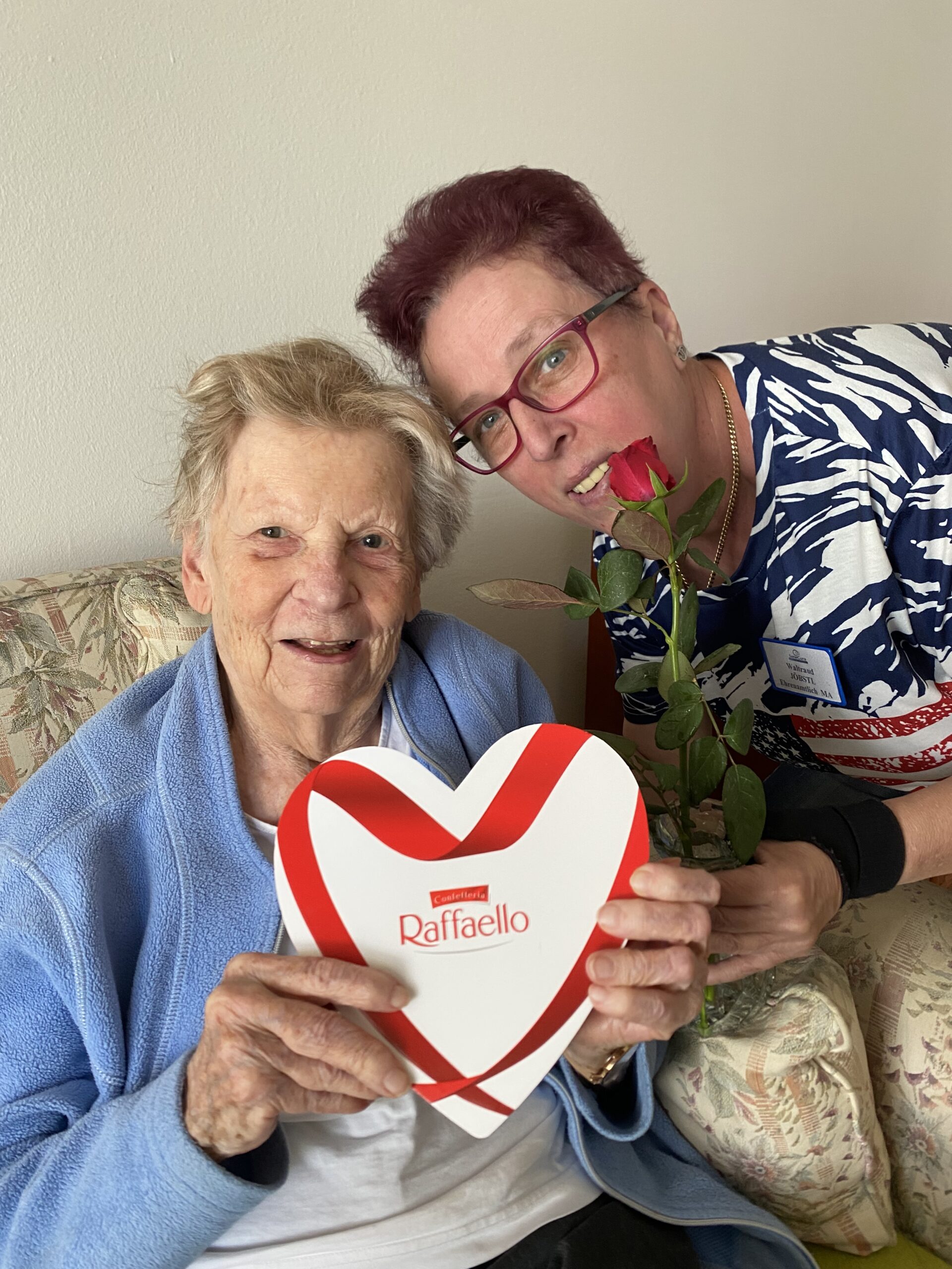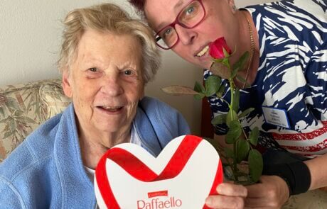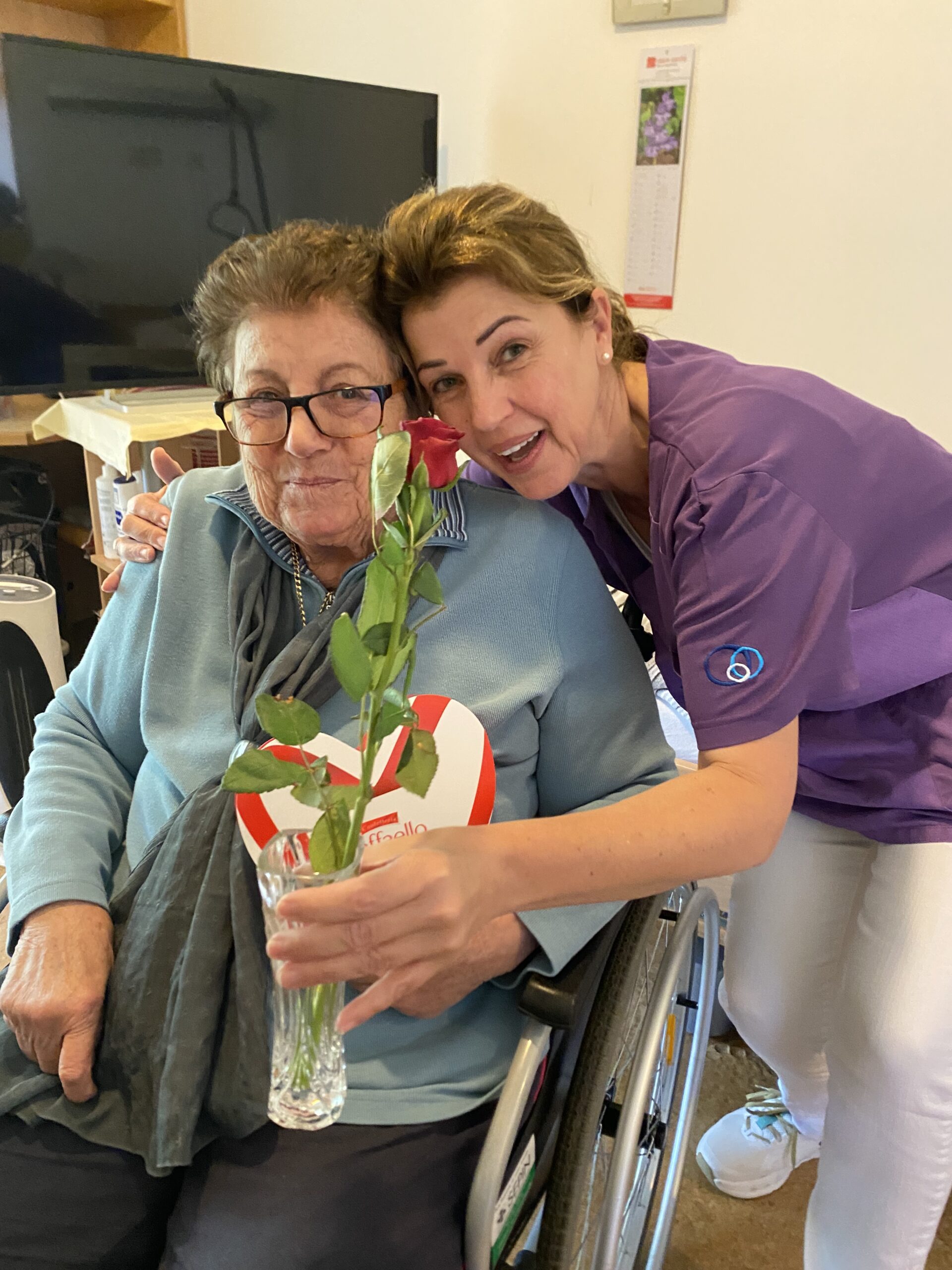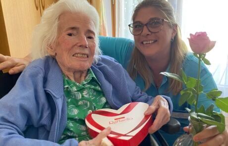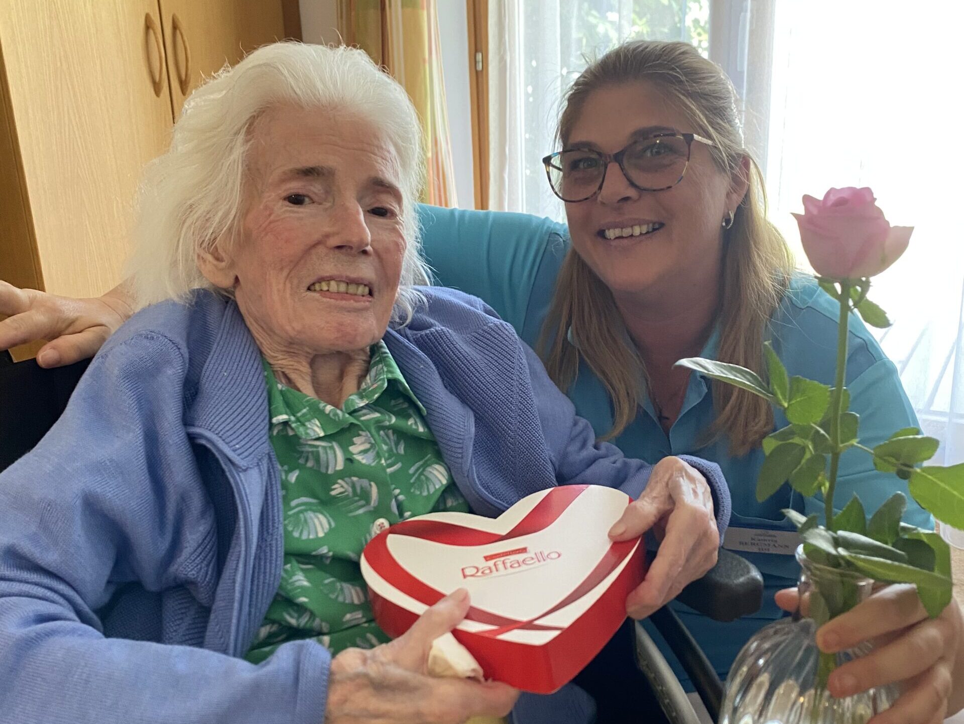 Über die Rose und die Schokolade freut sich die Seniorin sehr.