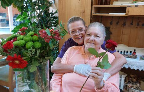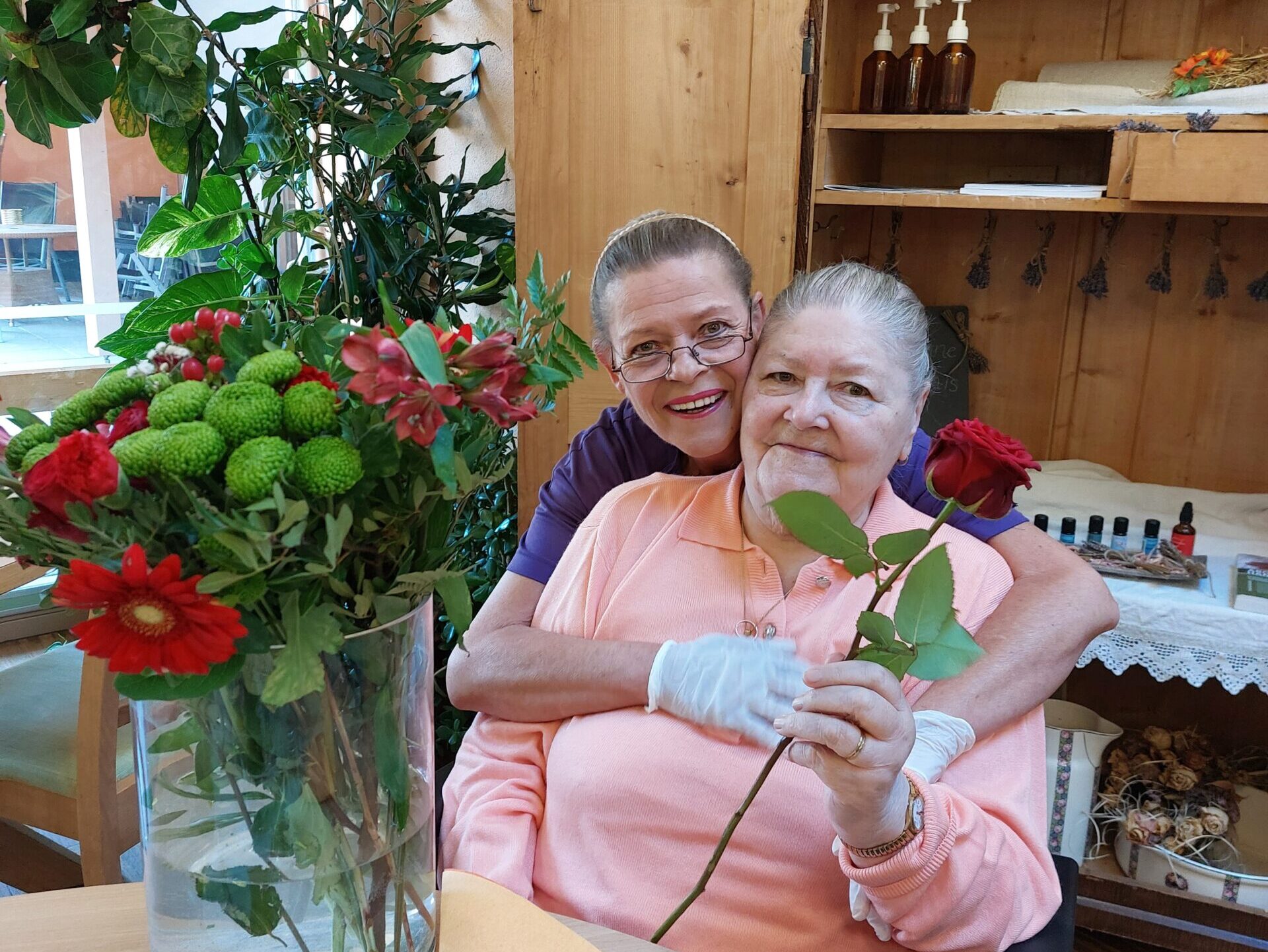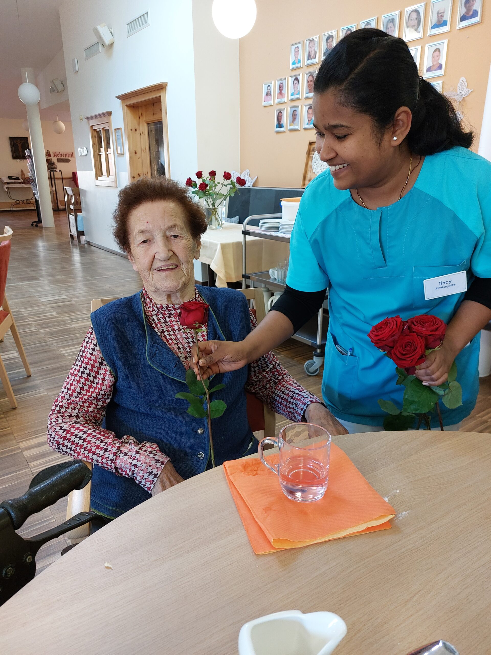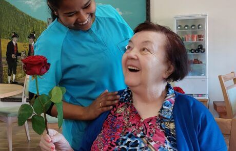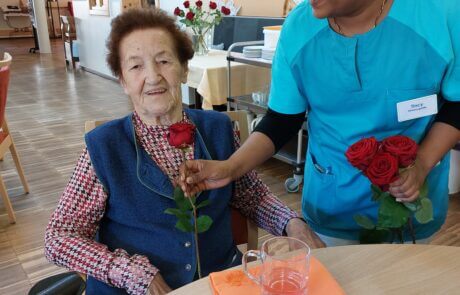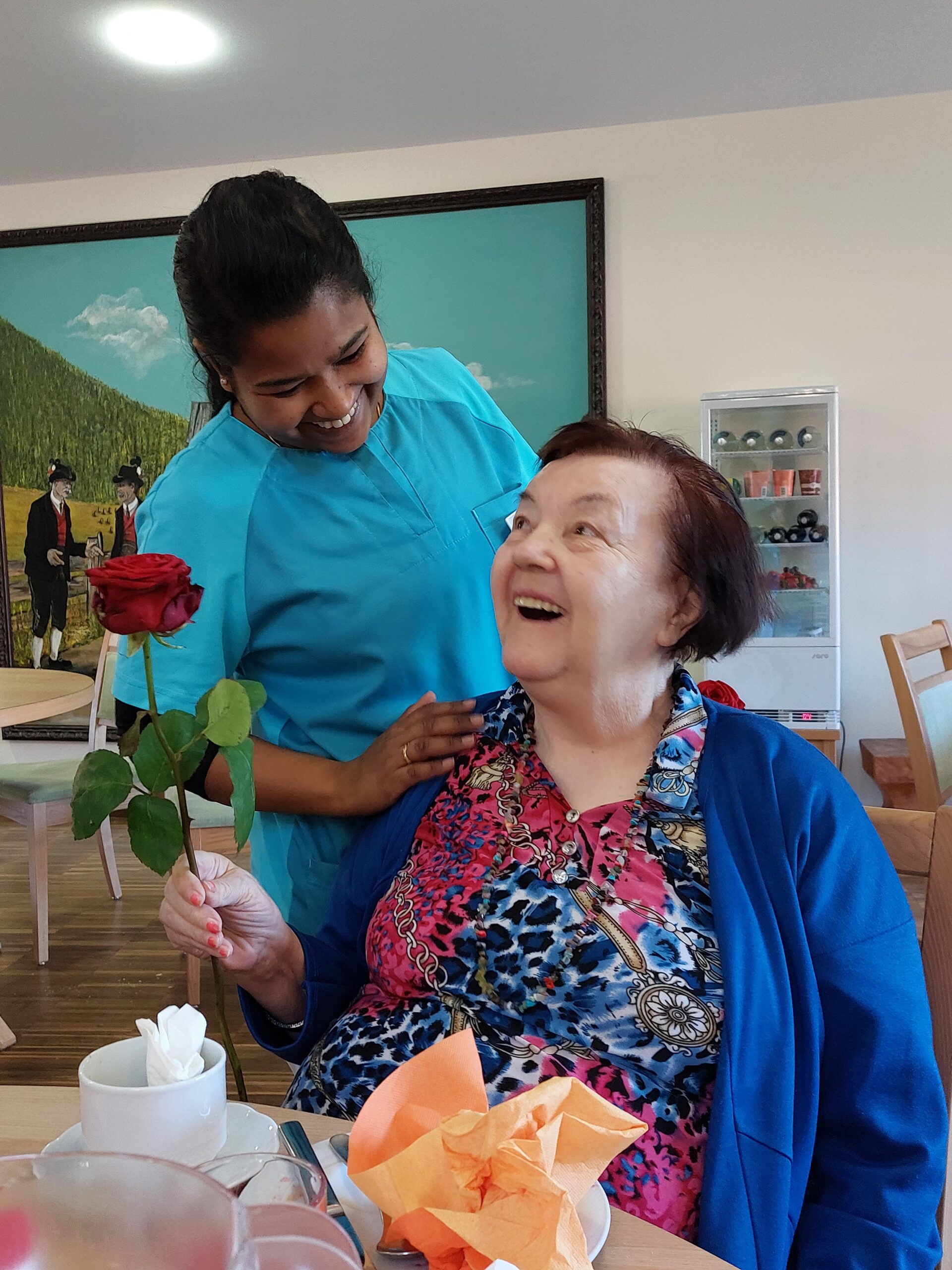 Die Bewohnerin freut sich sichtlich über die rote Rose.