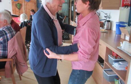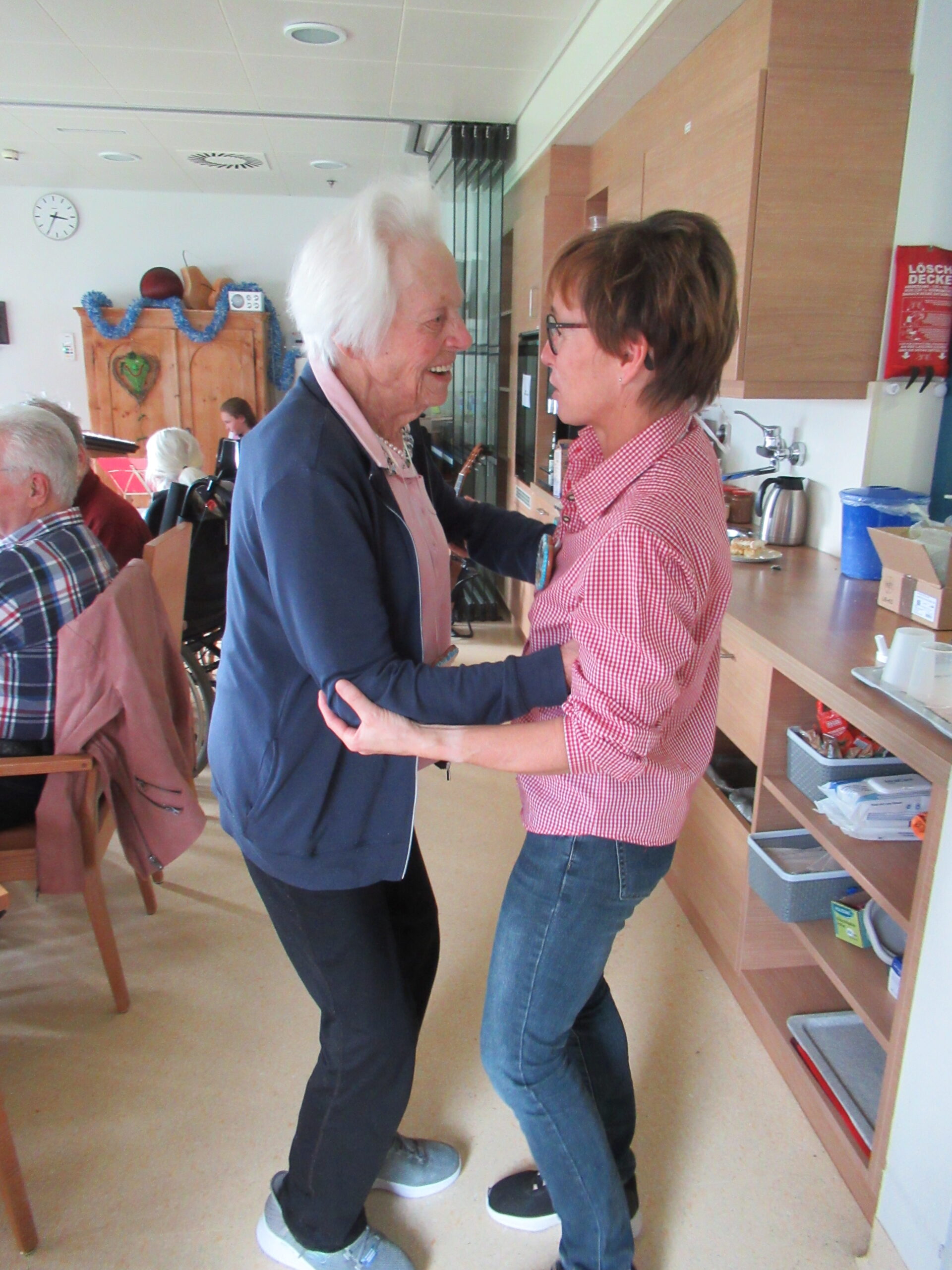 Bewohnerin Marianne beim Tanzbeinschwingen mit Mitarbeiterin Michaela