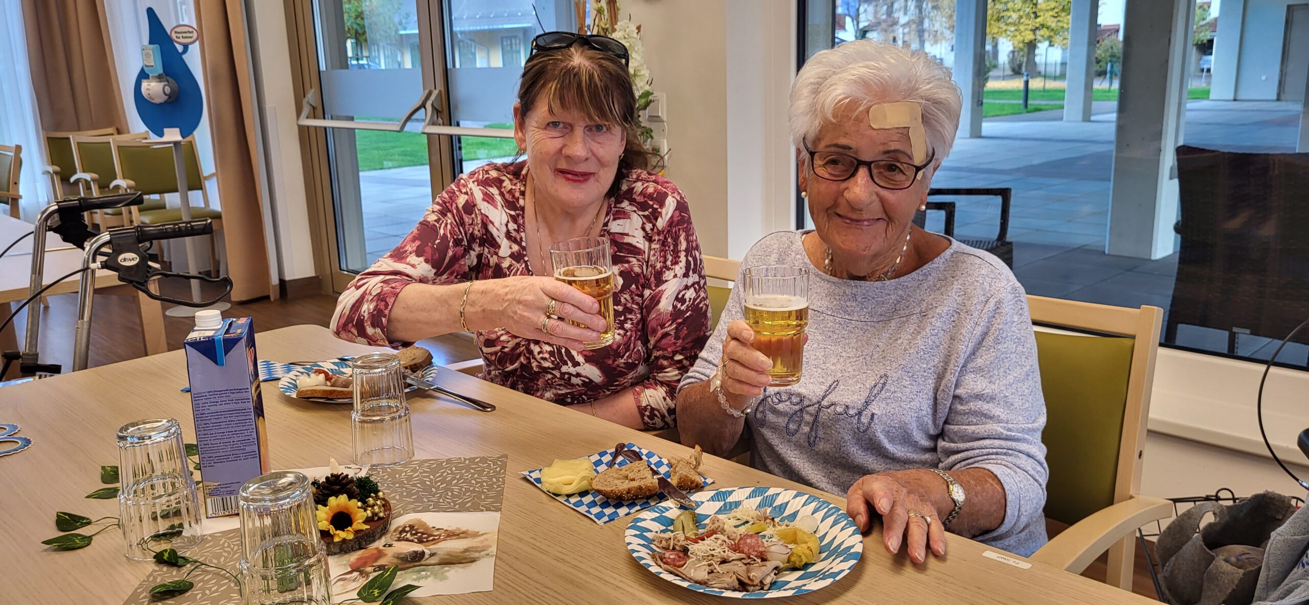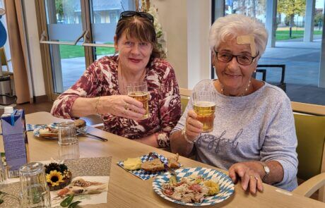Frau Schaumberger und Frau Stoll stoßen auf das Fest an.