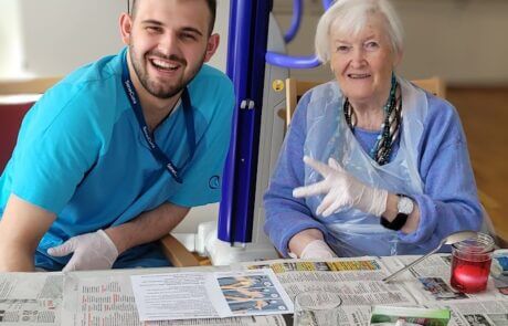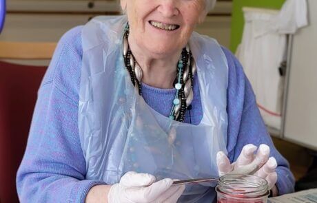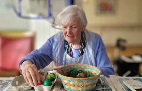 Die Bewohnerin hat sichtlich Spaß beim Eierfärben.